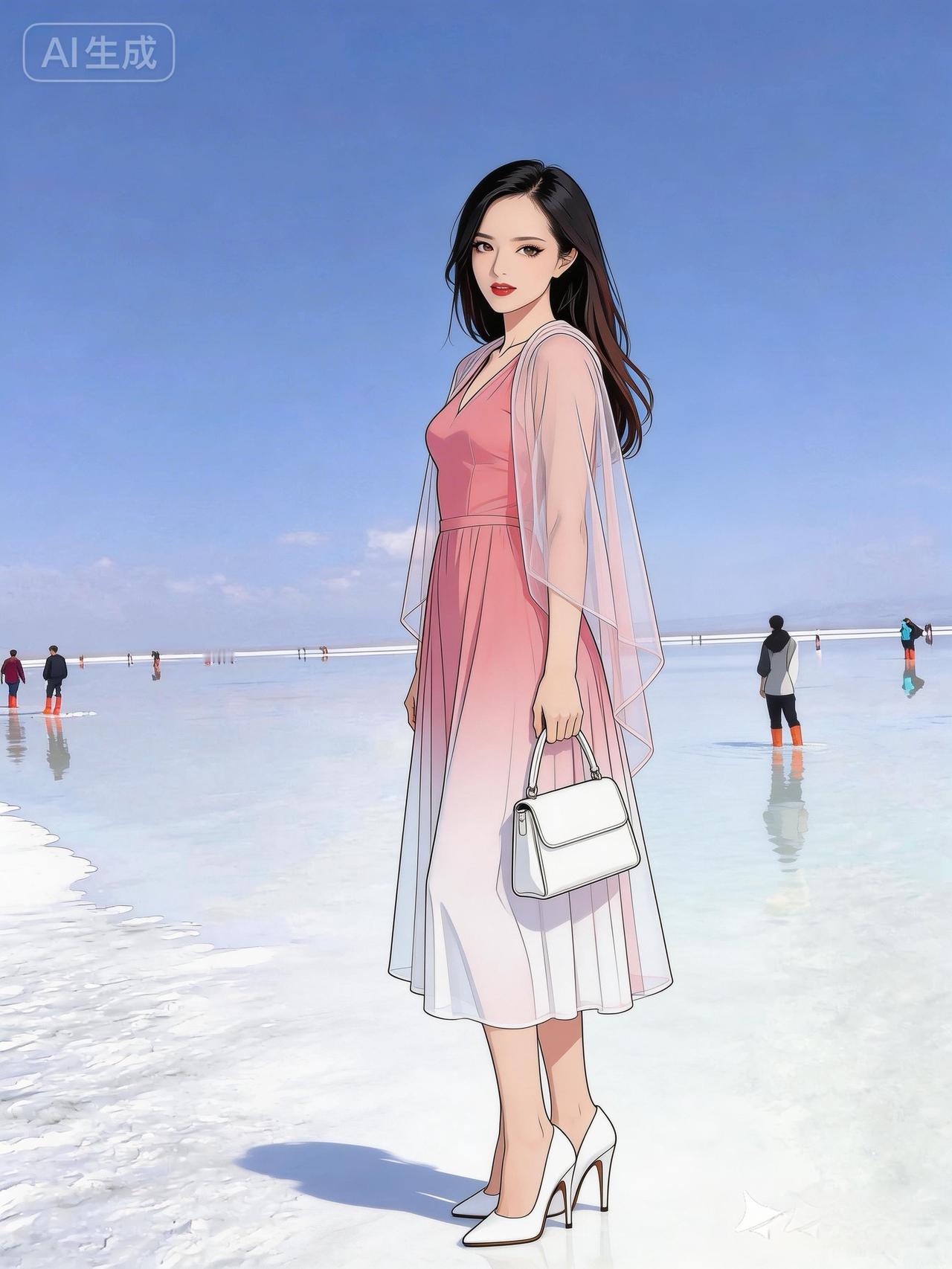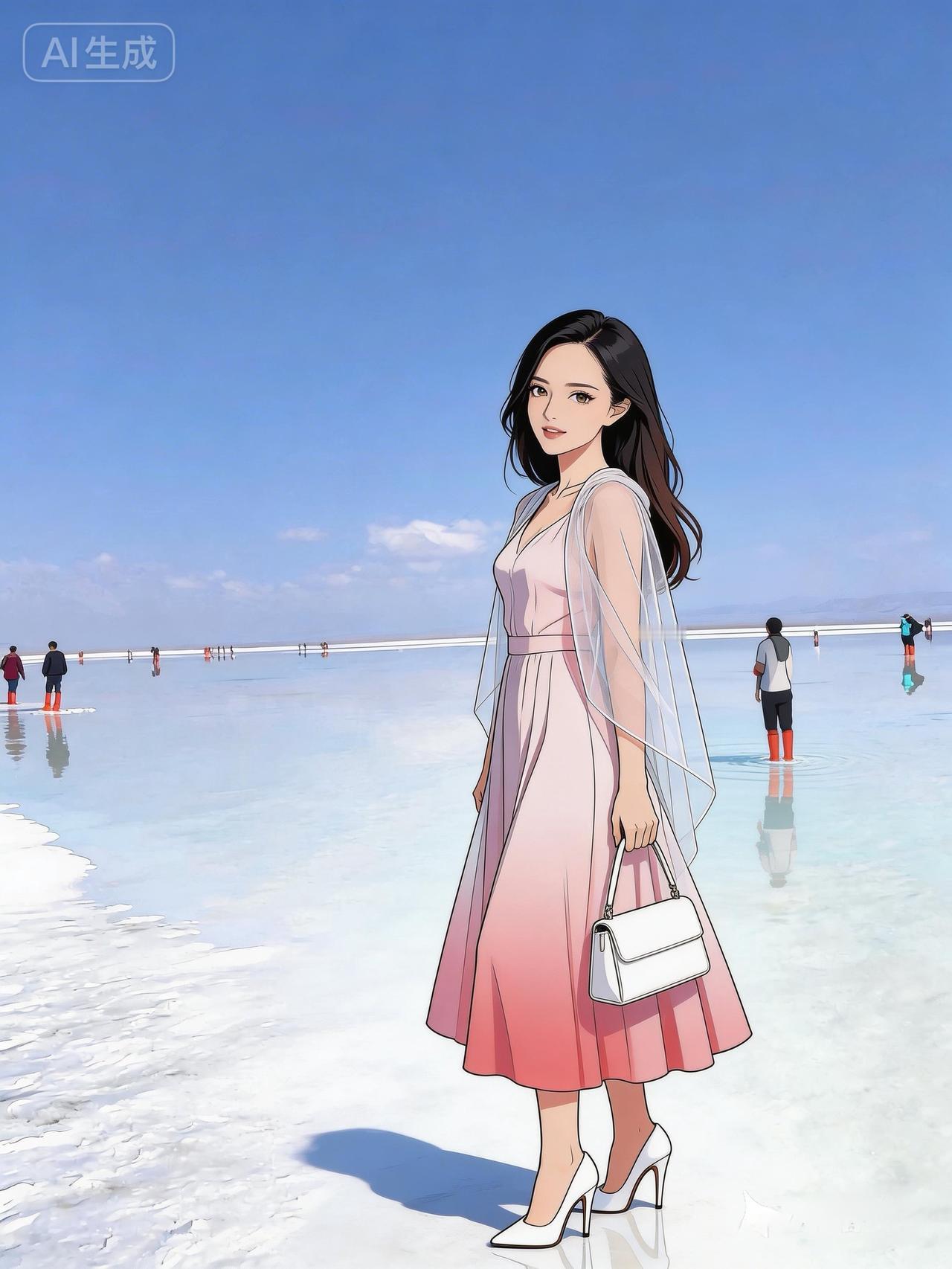 梦幻盐湖漫步,粉裙飘飘,尽享快乐!🌞👗🏖️