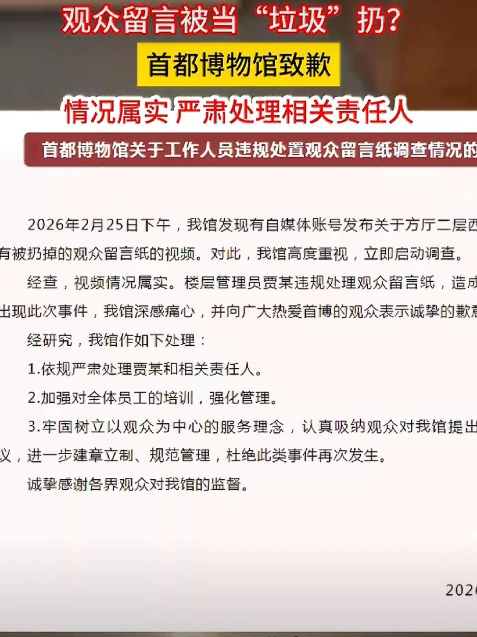 首都博物馆把观众留言扔垃圾桶这个事,总体来形容就是不出所料。 推一个不知名的人出来背锅,说他违规处理,等过了一段时间,这个事情没热度了,谁又知道到底是真处理还是假处理,再说了只是因为这次被人发现扔掉的行为,我很难不怀疑以前是不是也有同样的行为,除非能拿出以前的留言册,亏我还一直以为“北京欢迎你”这首歌是真的欢迎我们呢。