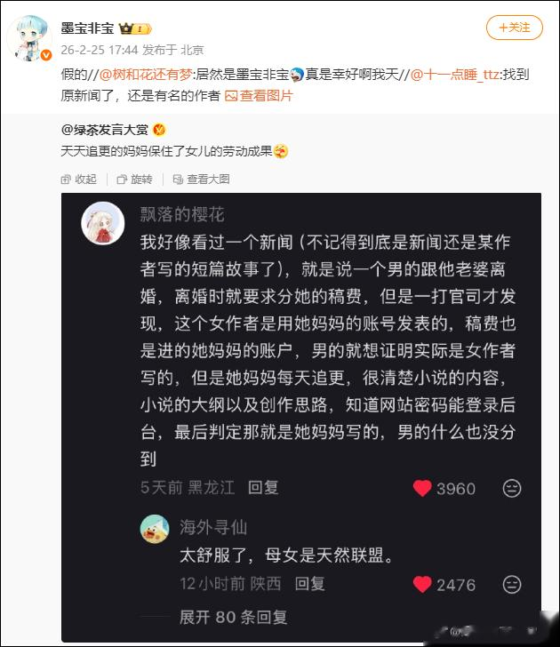 另外,就近期网络流传“母女联手保住稿费防前夫”的传闻,称其早年用母亲身份注册写作账号以规避离婚财产分割。墨宝非宝直接辟谣,称该说法为“假的”。
