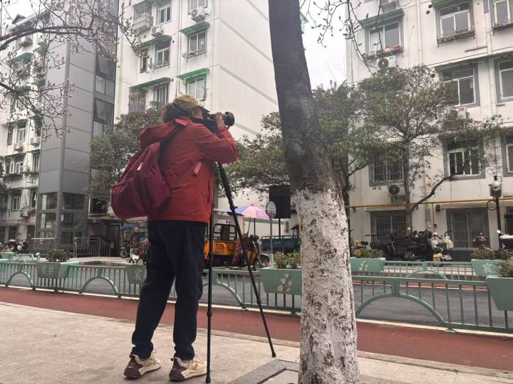 王阿姨带着专业三脚架和一台尼康照相机从宁波路一头走到另一头,他们专门找人少的地方,专注得拍着玉兰:“拍花很吃天气的,今天天气不好,背景太暗,就要挑角度了。”