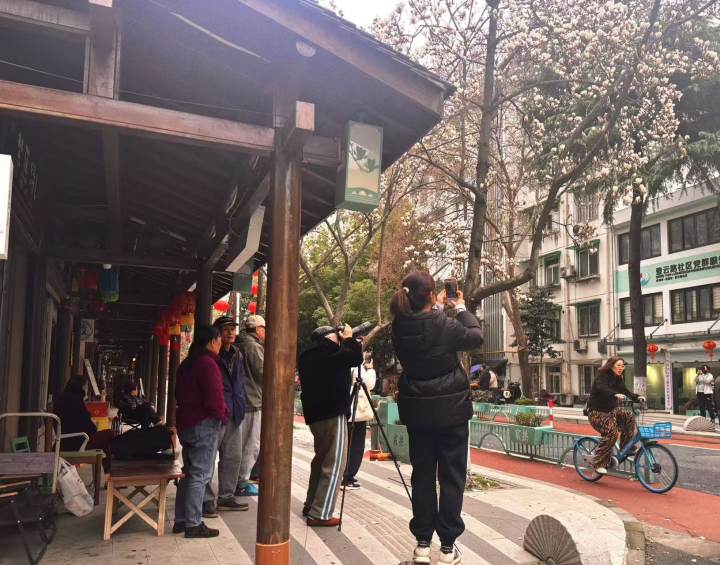 杭州的玉兰花一般花期在3月,盛花期通常在3月中上旬,花期持续一个月。今天去看,靠近金华路一侧的几株玉兰还是花苞状态;宁波路中段有几株玉兰已进入盛放,特别是高枝头的花,坠坠得一朵叠着一朵,吸引了不少摄影爱好者拍照;靠近登云路的一边,几株玉兰还是毛茸茸的褐色花苞。