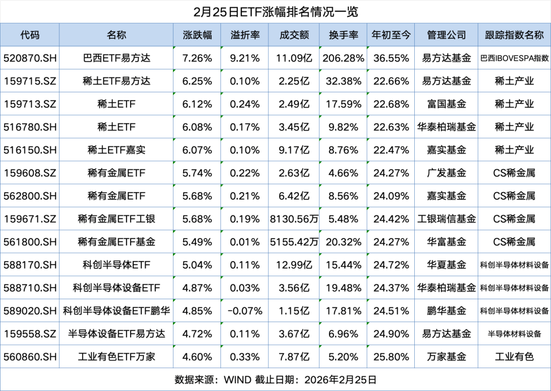 ETF市场火爆,当日全市场共有1052只ETF上涨,最高涨幅达7.26%!多只稀土、稀有金属、有色相关ETF涨幅居前,巴西ETF在跨境ETF中一马当先。