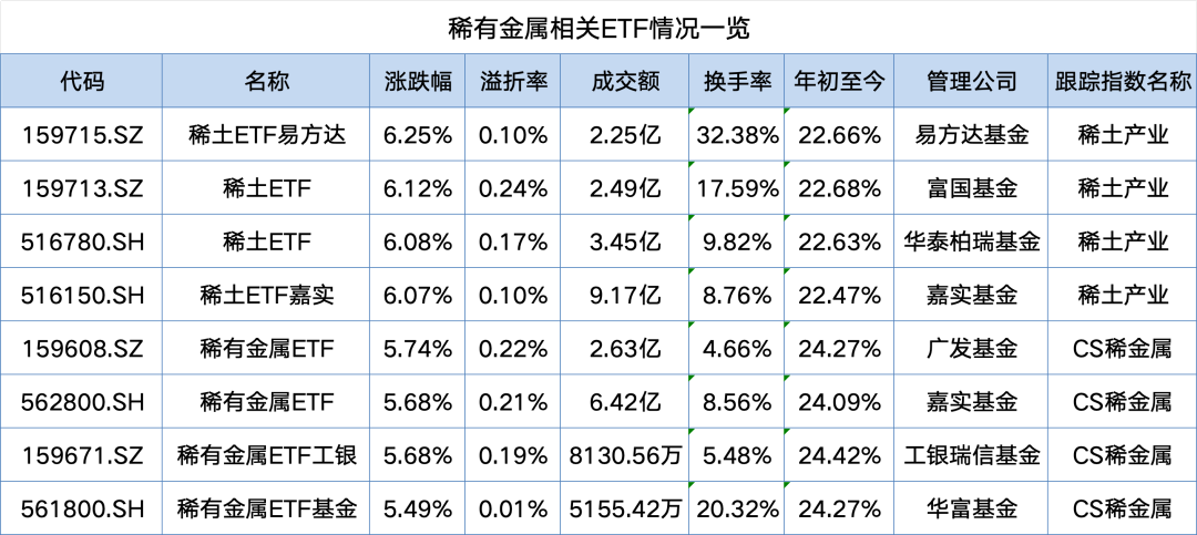 ETF方面,跟踪上述2个稀土指数的ETF共有8只,今日涨幅明显。