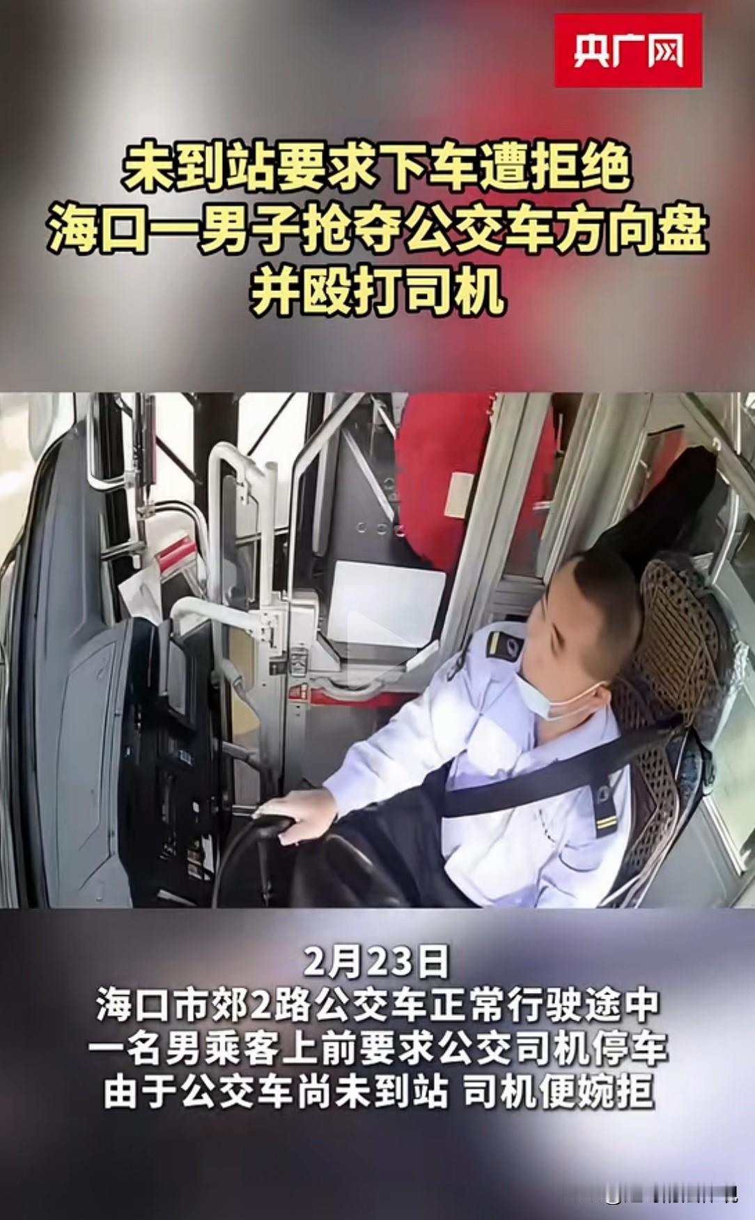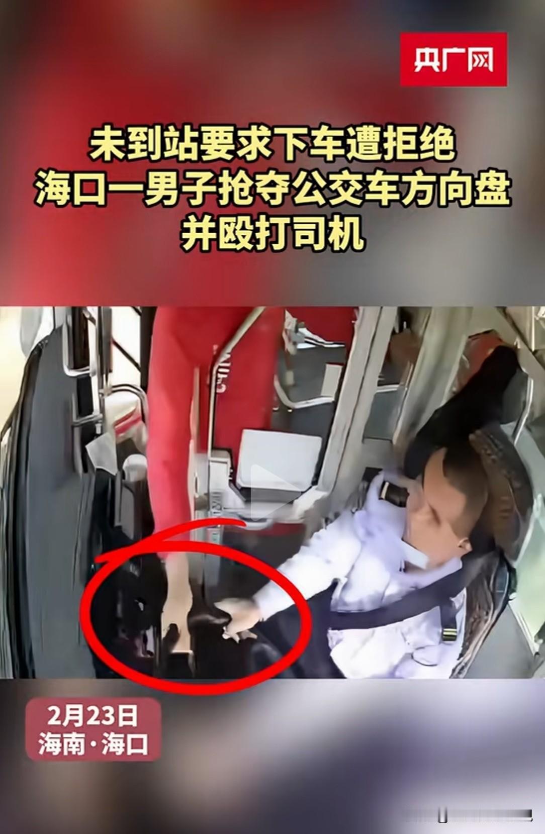 冲动是魔鬼!海南海口,公交车在正常行驶,一男子在不到站的情况下,要求司机师傅停车,非要当时下车。司机师傅拒绝后,男子突然上前抢夺方向盘,并殴打司机,随后威胁司机打开车门,下车后逃离。  他抢方向盘时,车速50公里每小时,车上的人吓得大叫。 司机公交车薛继全师傅后来回想起来,还觉得后怕的厉害。 那是他开公交车的普通一天,车到站后,一名身穿红色外套的男子上车。 投币后在车厢后排落座,车上还有5名乘客。 当时车速大概在50公里每小时左右。 15时30分左右,车辆即将到达一处红绿灯路口时,红衣男子走过来说:“开门,我要下车。” “还没到站。”薛师傅头也没回,按照公司规定回了一句。 男人说他有急事,必须现在下车。 薛继全解释了两句,说不到站不能停,这是规矩,也是为了大家的安全。 男人不听,声音越来越大,骂骂咧咧的。 然后,男子把一只手就伸进安全门,。 薛师傅还没反应过来,那人已经拽住了方向盘,并猛劲地往旁边拉。 车身剧烈晃动了一下,薛师傅本能地用双手死死攥住方向盘,整个人绷紧了,把方向往回扳。 他脑子里空白了一瞬间,但他只有一个念头:不能松手。 车子在路上扭了一下,幸好路上车不多,他稳住了。 男人没松手,还在拉方向盘。 薛师傅没时间看他,眼睛盯着前面的路,脚下开始减速。 他得靠边,得把车停下来,不然全车人都得跟着玩命。 他一边减速,一边跟那个男人说,你别动,再抢方向盘会出事的。 男人根本就不听,他又伸手拽了一次。 薛师傅一脚踩死刹车,车子猛地停住。 车上的人往前栽了一下,有人惊叫。 车停了,薛师傅才抬起头看了那个男人一眼。 男人还在骂,脸红脖子粗的,嘴里全是不干不净的话。 薛继全没吭声,掏出手机准备报警。 男人看见他拿出手机,怕他报警后自己受到处罚。 他隔着驾驶室的安全门,一拳一拳捶过来。 薛继全的手臂被捶了好几下,手机差点掉在地上。 他往旁边躲了躲,男人追着打,拳头砸在他手臂上,砰砰地响。 整个过程持续了大概一分钟。 薛继全没有还手。他一只手护着手机,一只手挡着,就这么挨着。 他说,那时候也没想别的,就觉得不能还手,一还手事情就更说不清了。 男人打累了,又开始踹门。驾驶室的安全门被他踹得哐哐响,整个车都在震。 他一边踹一边喊,让薛师傅开门,要进去打他。 薛师傅知道,他要是开了门,今天这事就没完了。 他看了一眼车里的乘客,那五个人都缩在自己的座位上,没人吭声,也没人上来帮忙。 他不知道他们是吓着了还是不想管,反正那时候他也顾不上他们。 为避免红衣男子做出过激行为,薛师傅还是把前门打开了。 男人愣了一下,地跳下车跑了。 薛师傅没多想,跟着就追了出去。 他一边追一边报警,眼睛盯着那个男人的背影。 男人跑得飞快,跑到路边拦了一辆电动自行车,跨上去就钻进了小路。 薛师傅追了几步,追不上,站在路口喘着气,看着那辆电动车消失在巷子里。 警方介入后调了监控,找到了涉事男人和他的家属,正在做进一步调查。 薛师傅去医院检查了一下,手臂被捶得又红又肿,医生给开了点药,让他回去休息。 他坐在医院的椅子上,看着自己肿起来的手臂,心里说不上是什么滋味。 公司的人上门看他,说给他申报“委屈奖”。 薛师傅听了没说话,他后来跟人聊起这事。 说车速50公里每小时的时候,那男人拽了一把方向盘,车差点就翻了。 如果翻了,车上那五个人,还有他自己,现在不知道在哪儿躺着。 他说他开了这么多年车,第一次遇到这种事。 他说他当时只有一个想法,手不能松,方向盘握住了,全车人的命就握住了。 薛师傅说,他希望以后别再遇到这种事。 有人认为,抢公交司机正在驾驶的公交车的方向盘,妥妥的危害公共安全。 起刑点三年以上有期徒刑,如果造成司乘人员和行人的伤亡,应判他死刑立即执行。 有人纳闷,当时车上的5个乘客都在干嘛? 如果公交车出了危险,他们还有命吗? 如果这个时候,车上有乘客从后面飞踢抢方向盘的那人一脚,算不算见义勇为? 《刑法》第133条之2:对行驶中的公共交通工具的驾驶人员使用暴力或者抢控驾驶操纵装置,干扰公共交通工具正常行驶,危及公共安全的。 处1年以下有期徒刑、拘役或者管制,并处或者单处罚金。 公交车在道路上行驶,涉及车上乘客及路上其他行人、车辆的安全。 抢夺方向盘或对驾驶人员使用暴力,会使车辆失去正常控制,极易引发重大交通事故,后果不堪设想。 红衣男子因未到站不能下车,就抢夺方向盘并殴打司机,其行为已严重危及公共安全。 符合该条款中,对行驶中的公共交通工具的驾驶人员,使用暴力,或者抢控驾驶操纵装置,干扰公共交通工具正常行驶,危及公共安全的情形。 对涉事男子,应按上述条款定罪处罚。 关注@赵哥的法律观,欢迎评论区发表您的看法。
