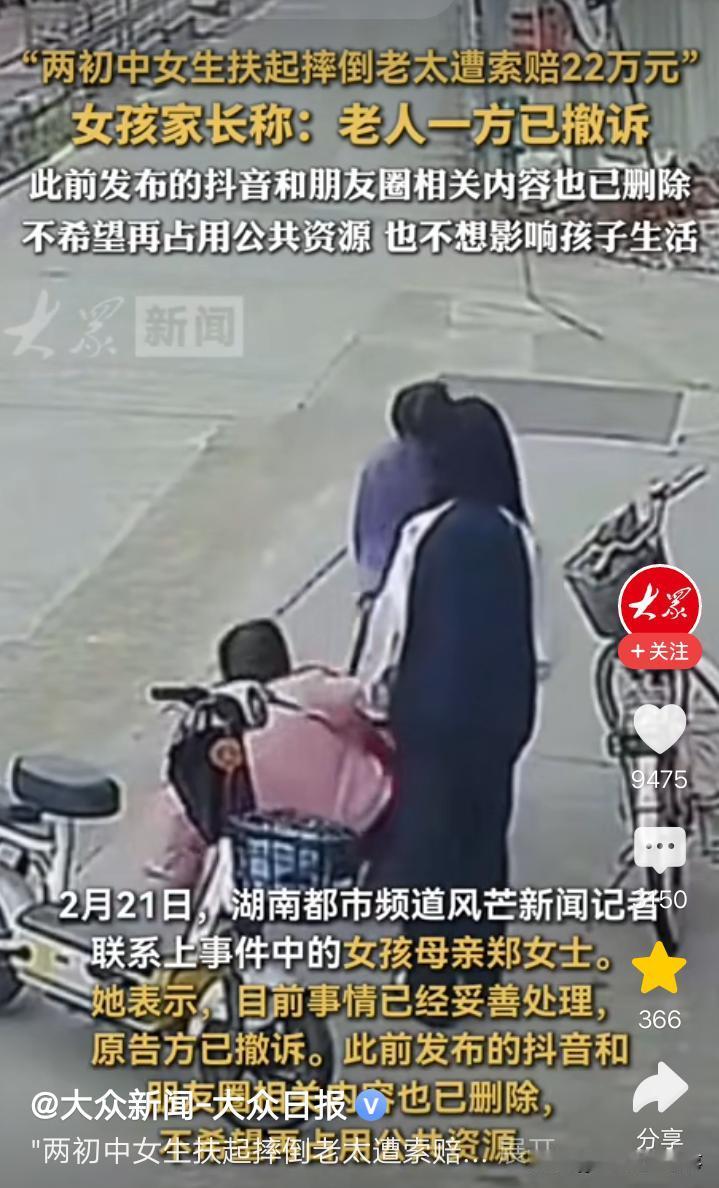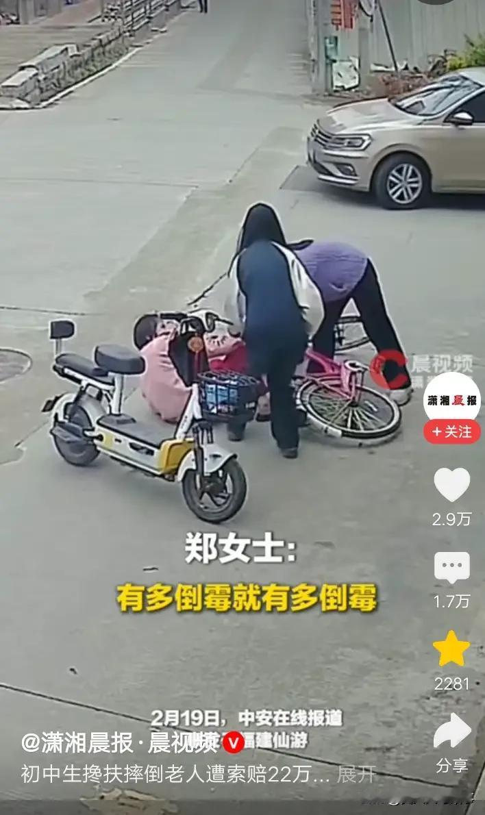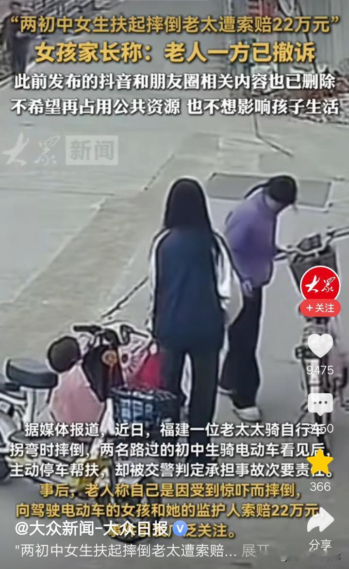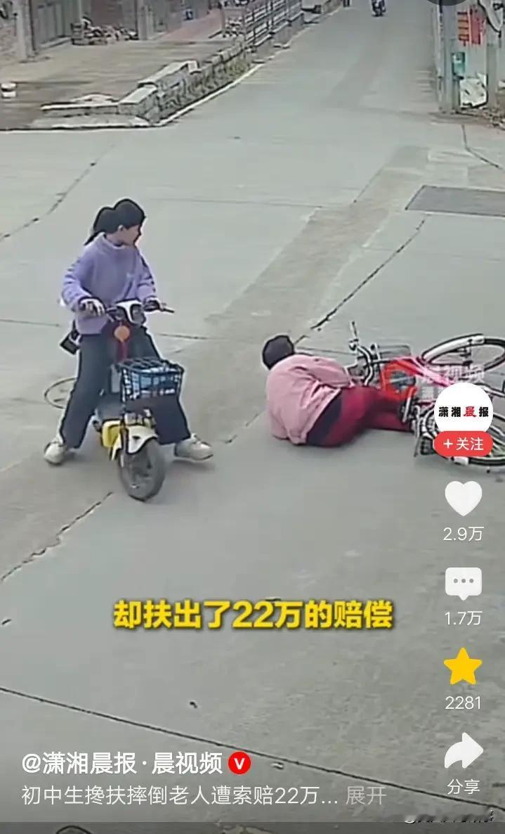 两初中女生好心扶老太,却被索赔22万赔偿,还被交警定为次责。 两初中女生骑车,看见一位老太骑自行车摔倒,她们好心搀扶老太,却被老太起诉到法院。 她们吓倒我,导致我摔伤,赔我各项费用22万,女生母亲网上维权后,剧情再次发生变化。 2025年3月15日,福建,下午15时许,初中女生萍萍,和女同学媛媛,相约去某地玩耍。 萍萍身穿紫色休闲衣,天蓝色裤子,扎高马尾,她骑着电动车,来到媛媛家门,接上媛媛。 一会儿,萍萍骑着黑色电动车搭乘媛媛,穿过狭窄村道上,向村口三叉路均速行驶。 此时,一位老太小红,骑着一辆自行车,正在村道上行驶。 忽然一辆白色轿车,从一条长巷驶出来,由南向北进入十字路村道,疾速向前行驶。 小红看见一辆白色轿车迎面驶来,她立即把自行车龙头,向右边最边沿转向,慢慢地向前驶。 过了一会儿,小红没有观察右边长巷里,有无车辆出入,她就加速向前行驶。 瞬间,萍萍骑着电动车,搭乘媛媛,从右边路口驶出,由南向北行驶,却没有看见小红骑自行车,正在村道十字路口行驶,未减速就转弯进入村道。 小红看见萍萍骑电动车,转弯过来,她吓了一跳,迅速捏住前后手刹。 自行车忽然向左侧倾倒,瞬间,小红连人带车摔倒在地上,自行车压在她脚上。 萍萍和媛媛心地善良,她们看见老太小红骑自行车摔倒在地上,她们毫不犹豫停车,奔过去把自行车从小红脚上拿开,将自行车停放在旁边。 媛媛和萍萍转过身来,把小红从地上搀扶起来,她们正想离开,却被小红抓住,你们吓到我,我才摔倒,你们要承担责任。 顿时,萍萍,媛媛满腹委屈站在原地,却想不明白,为什么我们好心搀扶老太,老太却翻脸无情,要求她们承担责任。 过了一会儿,交警驾车赶到现场勘查,调取监控视频,这次交通事故,小红骑车操作不当,导致自己摔倒,承担主责。 萍萍和媛媛骑车,和小红自行车零接触,但是转弯未让直行,承担次责。 数月后,小红摔伤治愈,她把萍萍,媛媛起诉到法院,索赔各项费用,共计22万元。 2026年2月,这起交通事故纠纷案,开庭审理前,萍萍的母亲,为此事在网上发声,引起网友热议,好心扶老人,却被讹22万,纷纷发表自己的意见。 几天,老太小红在此案开庭前,忽然撤诉,不再向萍萍,媛媛索赔22万。 而后,小红良心发现,主动和萍萍,媛媛和解。 此事件揭开人心险恶,但是扶人没错,却要拍下视频,防止被人讹钱。 文中人物均为化名。