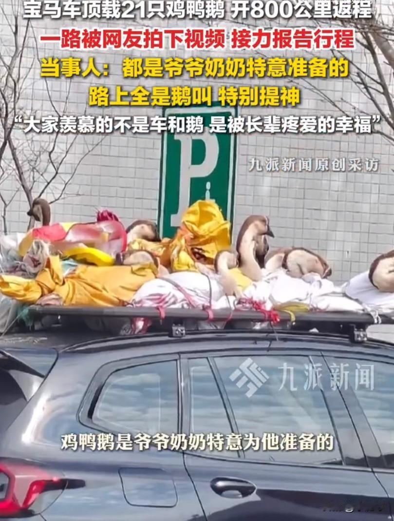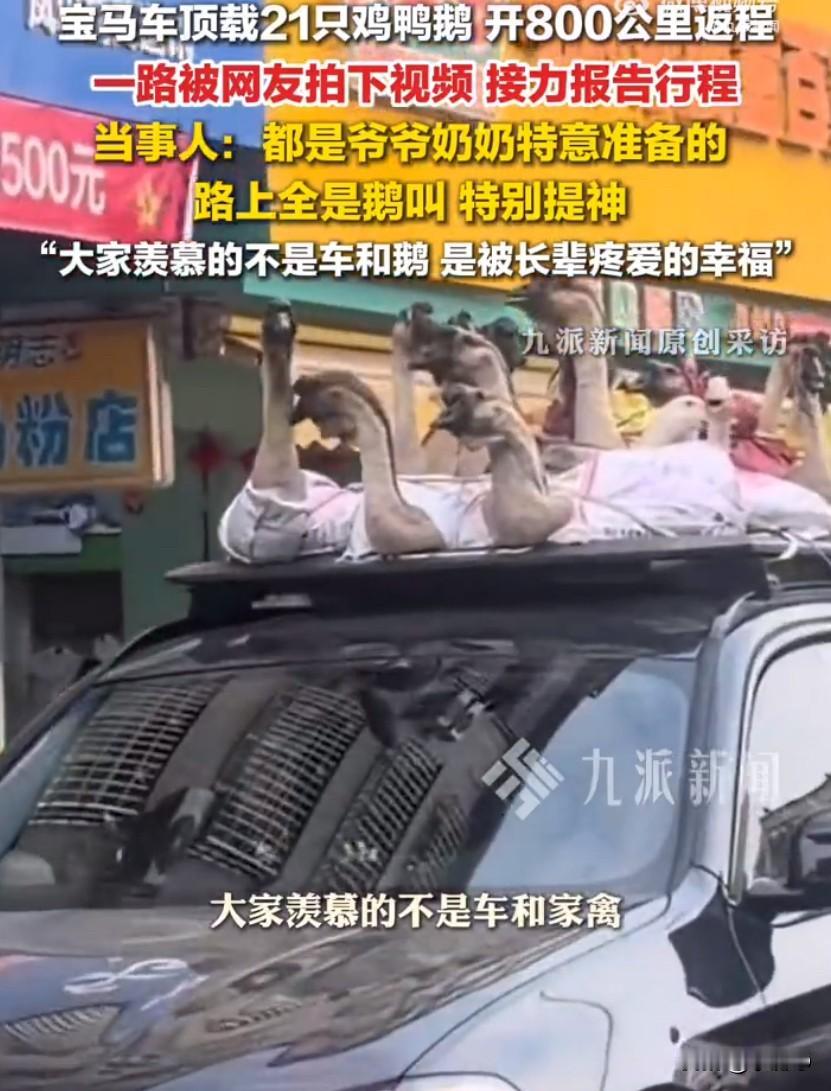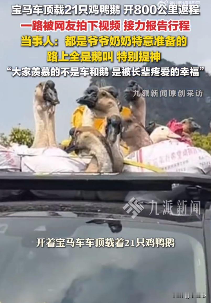 春节返程的车流里,一辆宝马车因为车顶的“特殊行李”火遍全网,不少网友一路跟拍接力,把这趟行程变成了大型围观现场。这辆车从广西出发开往广东,全程八百多公里,跑了二十多个小时,车顶上整整齐齐绑着十七只鹅、两只鸡、两只鸭,加起来一共二十一只活禽,画风又搞笑又暖心,被网友调侃成最接地气的豪华专车,也是全网最热闹的返程车队。车主平时喜欢改装车子,车顶刚好有行李架,临走时爷爷奶奶把自己养的家禽一股脑塞给他,担心杀好的肉放不久,特意让他带活的回去,能吃更长时间。这些鸡鸭鹅都是老人亲手喂大的,每一只都肥壮健康,是长辈眼里最实在的疼爱。后备箱早就被腊肉、土特产塞得满满当当,实在放不下,这才把活禽固定在车顶,一路小心翼翼护送,生怕有一点闪失。这一车组合实在太吸睛,豪车配家禽,画风反差感拉满,不管是路上的司机还是路边的行人,看到都忍不住拿出手机拍摄,视频传到网上后迅速刷屏,大家还给这辆车起了不少有趣的外号,有人说这是顶配移动家禽车,也有人调侃这是全网最接地气的豪华座驾。面对大家的好奇,车主本人也出面回应,这些鸡鸭鹅可不是随便买的,而是爷爷奶奶亲手喂养大的,其中有17只鹅,还有鸡和鸭,加起来一共21只,老人怕处理好的肉放不久,坚持让他带活的回去,能吃更长时间。一路上车厢外时不时传来家禽的叫声,车主开玩笑说,本来长途开车容易犯困,这下全程被叫声陪伴,别提多提神了,到家的时候这些小家伙还都活蹦乱跳的。返程途中还有不少人看到后主动出价想买下来,都被他一口拒绝,在他心里,这不是能用钱衡量的东西,是老人沉甸甸的心意,不管多少钱都不会卖。很多网友说羡慕这辆宝马,羡慕这一车顶的土货,其实大家真正羡慕的根本不是车和家禽,而是被长辈放在心尖上疼爱的幸福,不管孩子多大、走多远,在老人眼里永远是需要被照顾的小孩,恨不得把家里最好的东西全都打包让孩子带走。车主还说,自己打算专门挖个鱼塘把这些鹅养起来,不打算吃掉,好好留住这份来自老家的温暖。这件事之所以能戳中这么多人,就是因为说出了无数人的心声,每次从老家返程,后备箱和车里总会被父母长辈塞得满满当当,装的从来不是简单的食物,而是藏都藏不住的牵挂与疼爱,这样朴素又真挚的亲情,最能打动人心。春节返乡车 宝马车辆 宝马车顶行李箱 来源:九派新闻