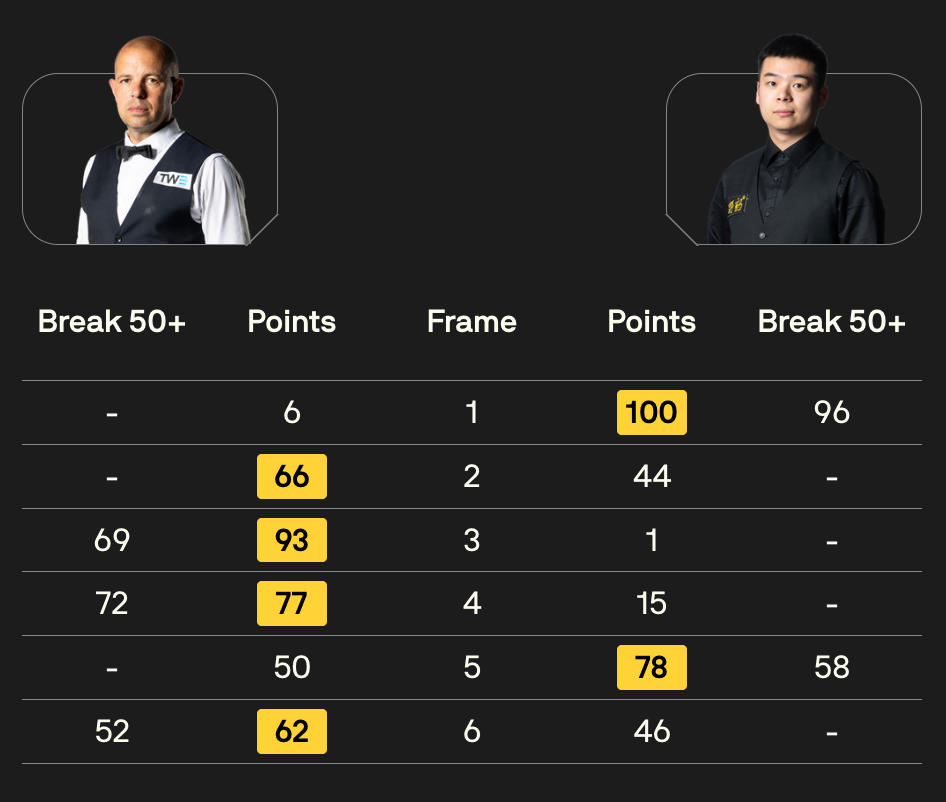 全场比赛,霍金斯共打出3杆50+(69、72、52),庞俊旭打出2杆50+(96、58)。