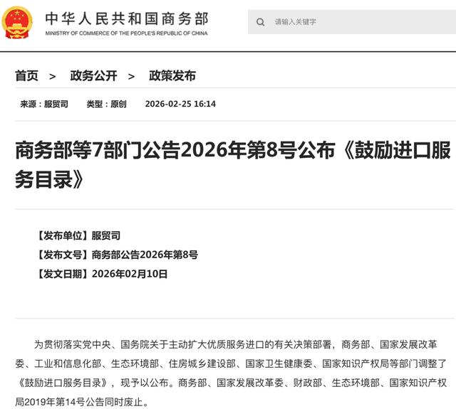 为贯彻落实党中央、国务院关于主动扩大优质服务进口的有关决策部署,商务部、国家发展改革委、工业和信息化部、生态环境部、住房城乡建设部、国家卫生健康委、国家知识产权局等部门调整了《鼓励进口服务目录》,现予以公布。商务部、国家发展改革委、财政部、生态环境部、国家知识产权局2019年第14号公告同时废止。(目录详情点击商务部等7部门公告2026年第8号公布《鼓励进口服务目录》阅读原文)