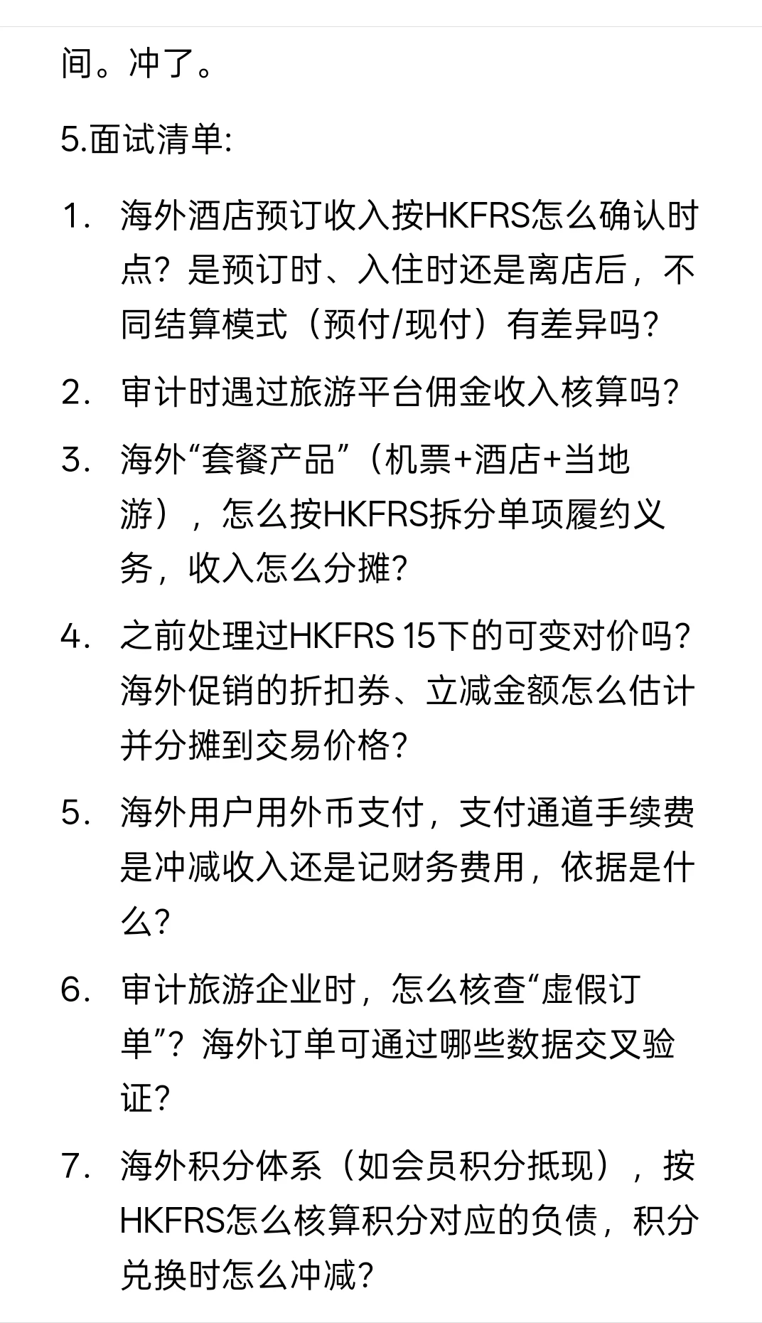 1. 海外酒店预订收入按HKFRS怎么确认时点?是预订时、入住时还是离店后,不同结算模式(预付/现付)有差异吗?