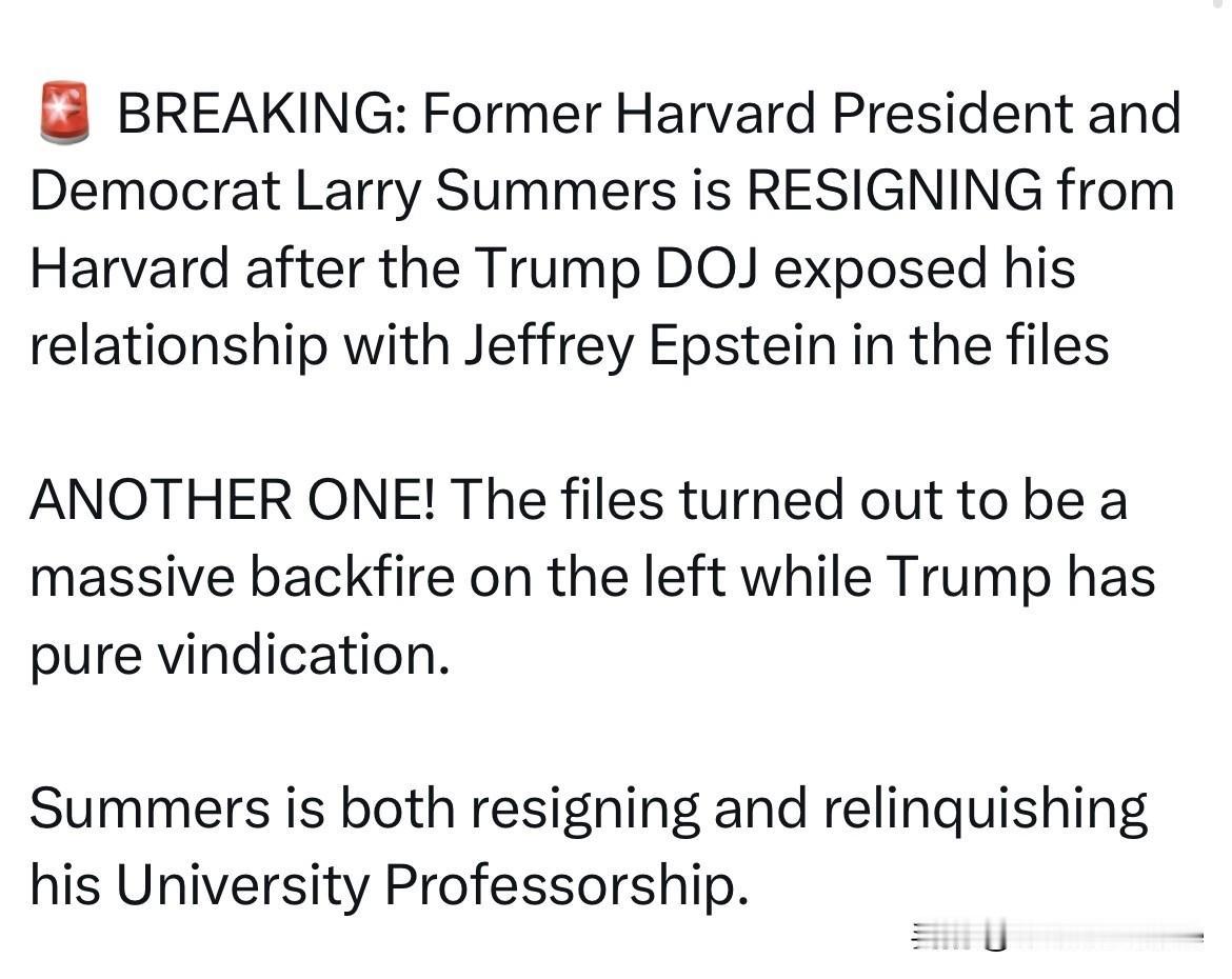 美国媒体报道突发新闻:前哈佛大学校长拉里·萨默斯在特朗普司法部在档案中揭露他与杰弗里·爱泼斯坦的关系后,将从哈佛大学辞职。 爱波斯坦案件的文件公开的事实证明,这些文件对民主党阵营的左派政治力量也受到很大冲击,与此同时,也是对特朗普阵营而言得到了喘息的机会。 萨默斯既辞职又放弃了哈佛大学教授的职位。