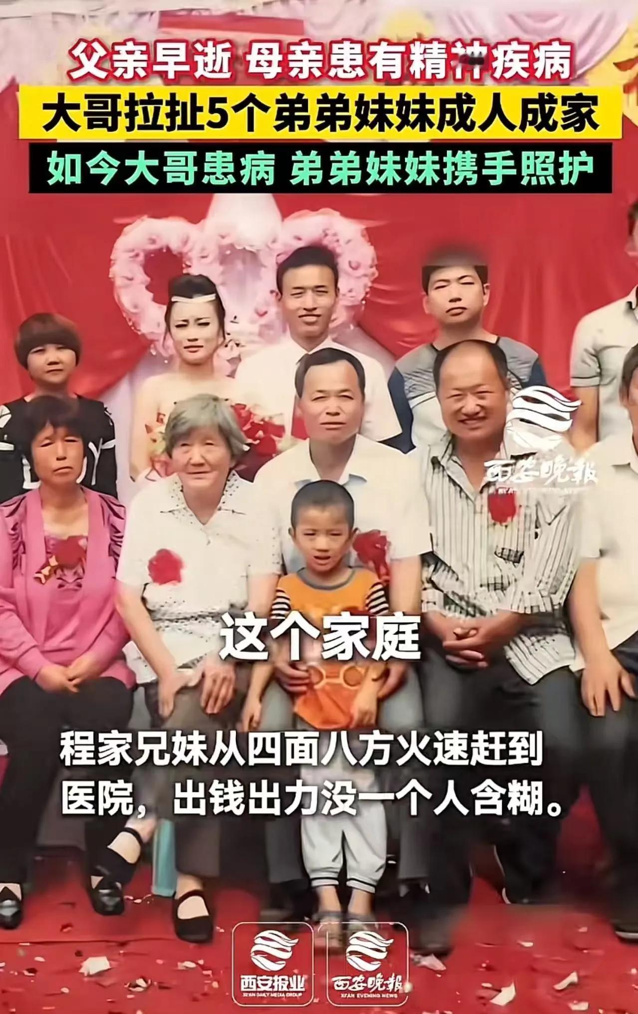 看哭了!父亲早逝,母亲患有精神疾病,大哥拉扯5个弟弟妹妹成人成家,如今大哥患病,弟弟妹妹的做法,令人泪目!网友:大哥用半辈子诠释了‘长兄如父’,弟妹用余生报答了这份恩情。” 这是一段令人动容的人生故事。父亲早逝,母亲又因精神疾病无法自理,家中失去了主要的支柱。面对困境,年长的大哥毅然挑起了家庭的重担,肩负起养育五个弟弟妹妹的责任。他放弃了自己的青春和梦想,日夜操劳,只为让弟弟妹妹们能够健康成长,顺利成家立业。 在那个艰难的年代,大哥没有怨言,没有退缩。他用勤劳和坚韧撑起了这个破碎的家。无论生活多么艰苦,他始终坚持让弟弟妹妹们接受教育,拥有更好的未来。每当弟弟妹妹遇到困难,大哥总是第一个站出来,给予支持和鼓励。他用半辈子的光阴诠释了“长兄如父”的深刻含义。 如今,大哥年事已高,身体也开始出现疾病的征兆。令人感动的是,弟弟妹妹们并没有忘记大哥当年的付出。他们纷纷回到大哥身边,悉心照顾,用自己的方式回报这份深沉的恩情。有的负责料理饮食,有的陪伴左右,确保大哥的生活无忧;有的承担起经济负担,确保大哥能够得到及时的治疗和康复。 弟弟妹妹们的举动让无数网友为之动容。有人说:“大哥用半辈子诠释了‘长兄如父’,弟妹用余生报答了这份恩情。”这不仅是血浓于水的亲情,更是对责任与爱的最好诠释。这样的故事,让人看到了人性中最温暖、最坚韧的一面。 这段经历告诉我们,家庭的力量是无坚不摧的。无论遇到多大的困难,只要有爱,有责任心,就能够战胜一切。大哥的无私奉献和弟妹们的感恩回报,正是这个世界上最美好的情感体现。 在现实生活中,或许我们也能从这故事中汲取力量。无论身处何种境地,都不要忘记对家人的关爱和责任。正是这些点滴的付出,构筑了一个温暖的家,也让我们的人生更加有意义。 这段故事让人泪目,也让人心生敬意。它提醒我们,亲情是人生最宝贵的财富,珍惜身边的亲人,用心去守护这份情感,才是人生最值得追求的幸福。愿每一个家庭都能像这位大哥和他的弟弟妹妹们一样,携手共度风雨,共享人生的温暖与光明。