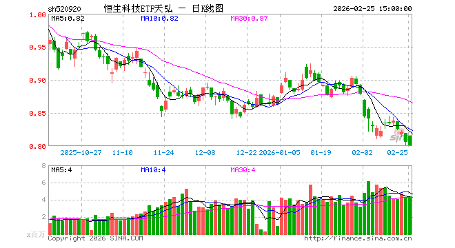 2月25日,恒生科技ETF天弘(520920)跌0.62%,成交额3.55亿元。当日份额增加2.00亿份,最新份额为188.06亿份,近20个交易日份额增加39.97亿份。最新资产净值计算值为150.22亿元。