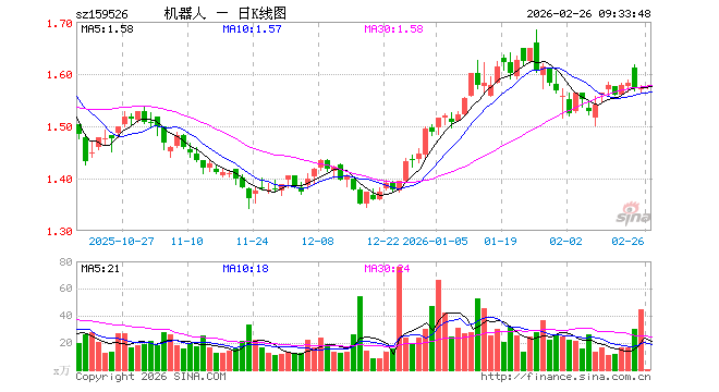 2月26日,机器人ETF嘉实(159526)开盘涨0.00%,报1.574元。机器人ETF嘉实(159526)重仓股方面,科大讯飞开盘涨0.02%,汇川技术跌0.35%,拓普集团涨0.01%,大华股份涨0.16%,大族激光涨1.14%,双环传动跌0.47%,石头科技涨0.05%,中控技术跌0.46%,绿的谐波跌1.52%,机器人涨0.06%。