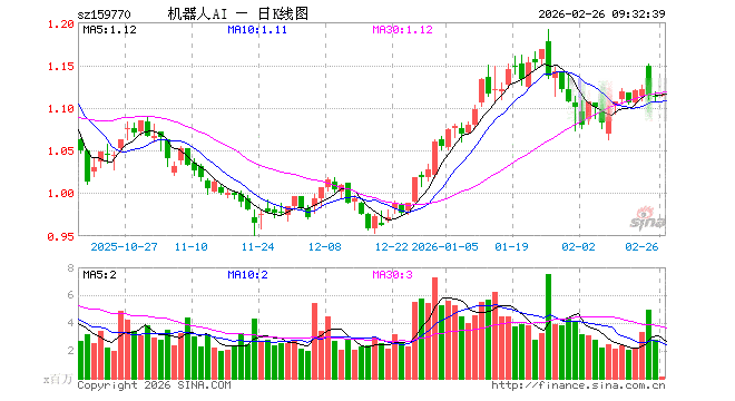 2月26日,机器人ETF(159770)开盘涨0.00%,报1.114元。机器人ETF(159770)重仓股方面,科大讯飞开盘涨0.02%,汇川技术跌0.35%,拓普集团涨0.01%,大华股份涨0.16%,大族激光涨1.14%,双环传动跌0.47%,石头科技涨0.05%,中控技术跌0.46%,绿的谐波跌1.52%,机器人涨0.06%。