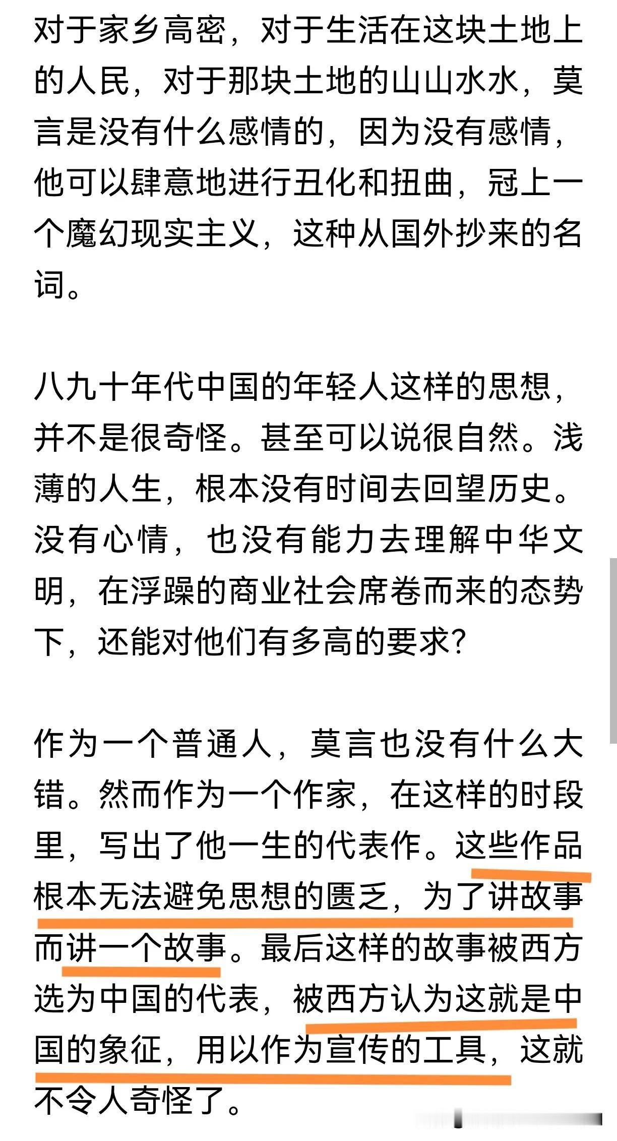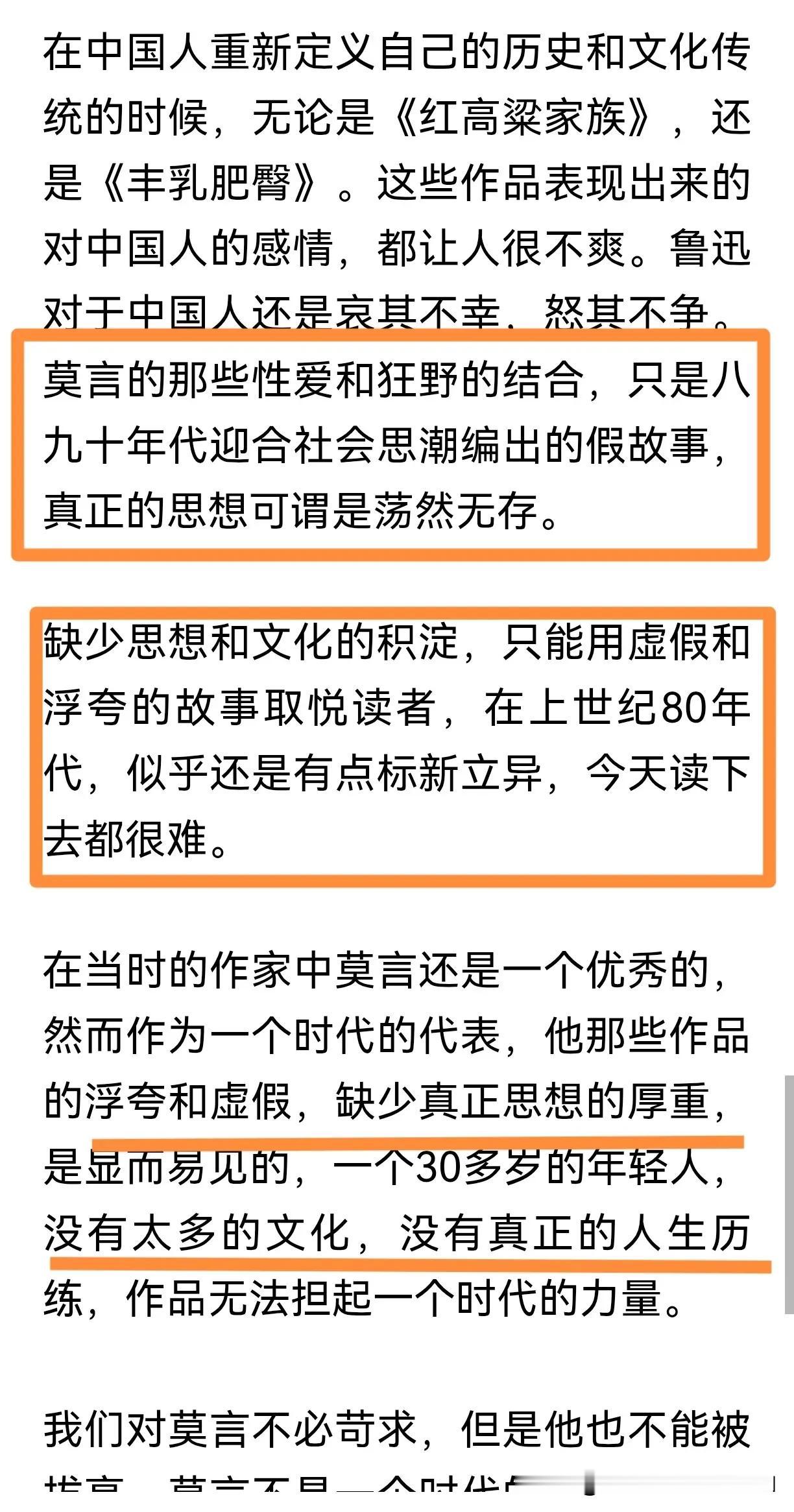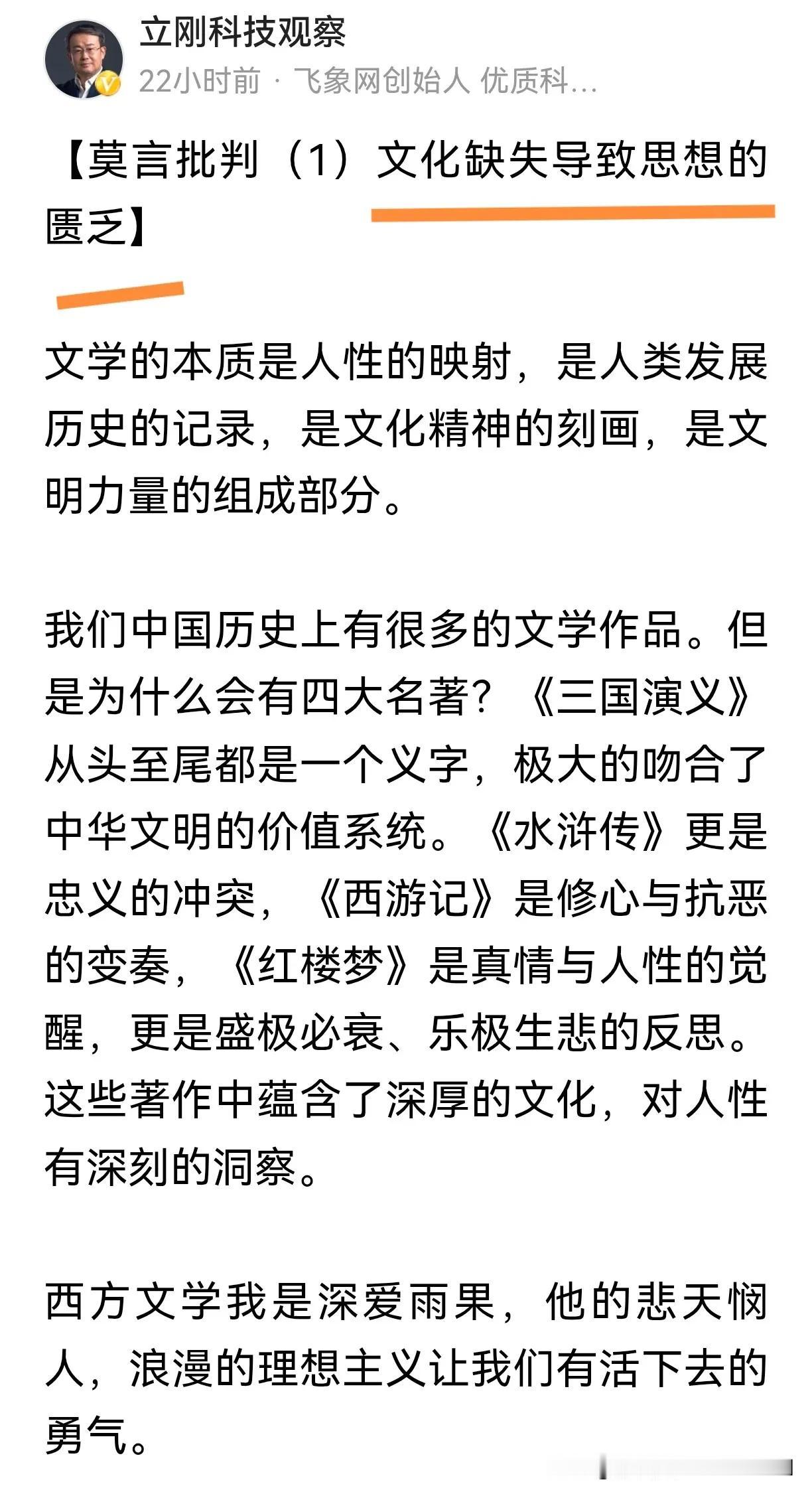 项立刚【莫言批判(1)】《文化缺失导致思想的匮乏》的归因偏差。 项立刚批莫言,已经写了两篇文章,第一篇简单归莫言为伪民俗。第二篇!是真的。 先把项立刚和莫言双方核心观点说清楚,再谈分歧与意义。 一、【项立刚批判1】为什么归因为“文化缺失”。 文章前半部分是莫言教育经历。创作期(30–40岁)社会浮躁、自我否定,他文化积累不足。“没有太多的文化,没有真正的人生历练”。与鲁迅、郭沫若等前辈比,文化浸润不够、思想无厚重感。“缺少真正思想的厚重”。对家乡、人民、革命历史无感情、肆意丑化,用“魔幻现实主义”包装。“缺少思想和文化的积淀,只能用虚假和浮夸的故事取悦读者。” 因而他作品的浮夸和虚假,那些性爱和狂野的结合,只是八九十年代迎合社会思潮编出的假故事,“真正的思想可谓是荡然无存。”。项立刚的核心判断是,莫言是伪民俗、文化缺失、思想肤浅。莫言的作品是为讲故事而讲故事,被西方选中做“中国符号”。 一句话:问题出在文化根上,不是立场,是文化缺失导致思想与价值偏差 二、莫言的是如何看自己的作品的。 莫言是2012年获得诺贝尔文学奖的。得奖后,莫言虽然说过文学不是用来唱赞歌的。也说过把好人当坏人写,把坏人当好人写。但都没有怎么说得十分清楚。 但在获奖之前,他是说清楚了。2009年他在北大演讲时是这样说的。 “前辈作家受时代局限,只能站在阶级立场、无产阶级立场、革命军队立场写作;我要站在超阶级立场处理题材、写人物。如果只站在八路军、解放军立场,写出的东西一定片面;历史教科书可以这样写,但小说不能原谅。” 他的创作观有这样几个方面。 首先,他说要突破《延安文艺座谈会讲话》的阶级性、工具性局限 。他说这只是一个历史文献,在当时有巨大作用,但现在应该突破。 他主张写人的命运、人性、民间真实,而非阶级叙事。 他明确提出自己在追求“四个超越”。即超越阶级、政治、国家,站在全人类立场。 他主张不是“为老百姓写作”,而是“作为老百姓写作”,平视民间。 他的文学观用一句话概括,就是“超阶级、写人的文学” 三、项立刚和莫言对文学认知的分歧 1. 归因完全相反。 项立刚把莫言的小说归因文化缺失,因而思想浅薄因而价值扭曲。 莫言把自己的小说归因为立场突破 ,因而要超越阶级、回归人性、文学独立。 2. 项立刚和莫言对文学功能认知是对立的。 项立刚认为文学应扎根中华文化、承载民族精神、服务历史与人民立场。他否定“超阶级”,认为莫言是脱离文化、否定传统、迎合西方的文学观。 而莫言认为文学要独立于政治与阶级工具,写真实人性与民间生态的。 “超阶级”是文学的全面性要求,不是否定革命历史 3. 项立刚和莫言对“前辈写作”的态度也是相反的 项立刚肯定前辈的文化厚度与立场坚守,批评莫言背离。 而莫言承认前辈的时代局限,主张突破与超越,追求文学主体性 总结来看项立刚与莫言的争论 首先,这是两种文学观的碰撞。 项立刚认为应当回归文化本位,立场优先,体现价值承载。 而莫言则认应坚持人性本位,文学独立,展现多元真实。 项立刚的批判,抓住了文化认同与历史叙事的严肃性。而莫言的主张,回应了80年代思想解放、文学回归自身的时代需求。 两人文学观本质区别在于文学该站在什么立场、为谁而写、如何处理历史与人性的永恒命题。 结语:项立刚对莫言的批判归因是有偏差的。还是莫言对自己作品的归因说得透。莫言之所以写出那样玄幻的小说,不单单是文化问题,更主要的是立场问题。