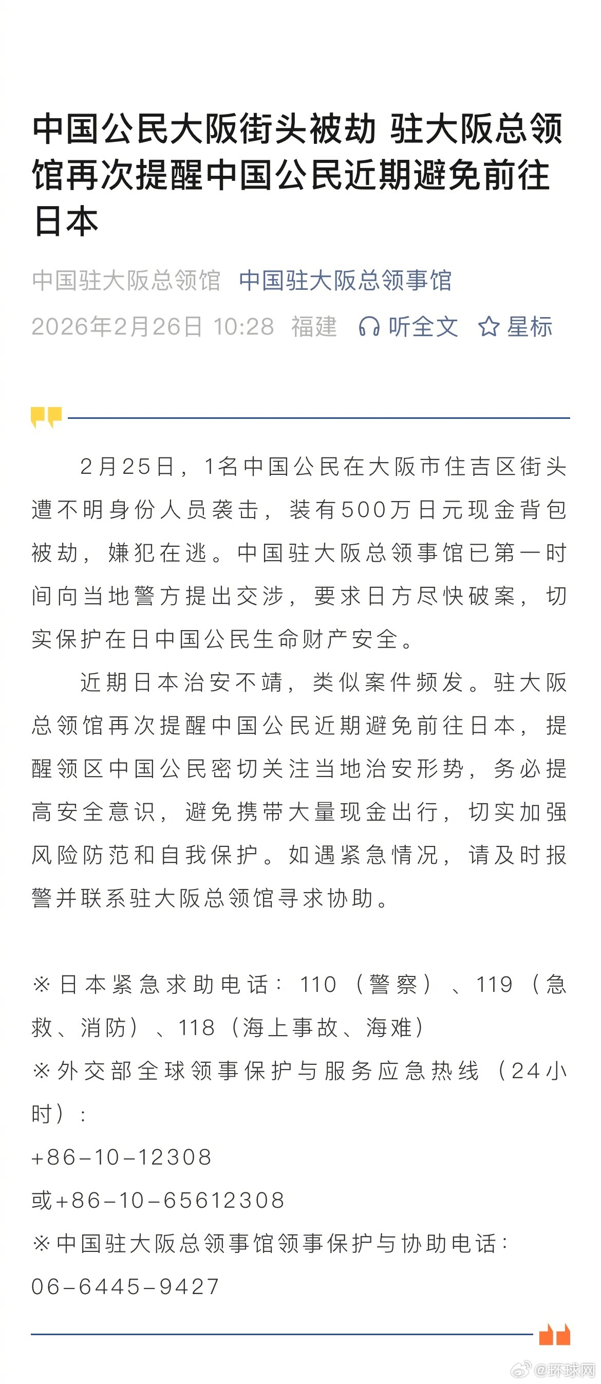 #中国公民大阪街头被劫500万日元#【中国公民大阪街头被劫 驻大阪总领馆再次提醒中国公民近期避免前往日本】#再次提醒中国公民近期避免前往日本#