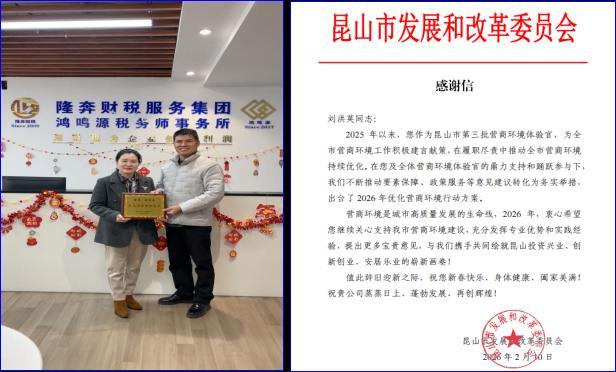 在专业服务之外,刘洪英持续将社会责任融入企业发展。自2019年起,隆奔财税与昆山市正九公益服务中心建立长期合作,持续参与助学、扶贫、社区服务等公益项目。2026年2月,集团被昆山市正九公益服务中心授予“慈善爱心企业”称号,刘洪英个人获颁“第三届理事会成员”慈善奖章。2025年,她受聘担任“昆山市第三批营商环境体验官”,以专业视角为地方政策优化建言献策。本月,刘洪英收到昆山市发改委感谢信,对其在营商环境建设中的贡献表示肯定。
