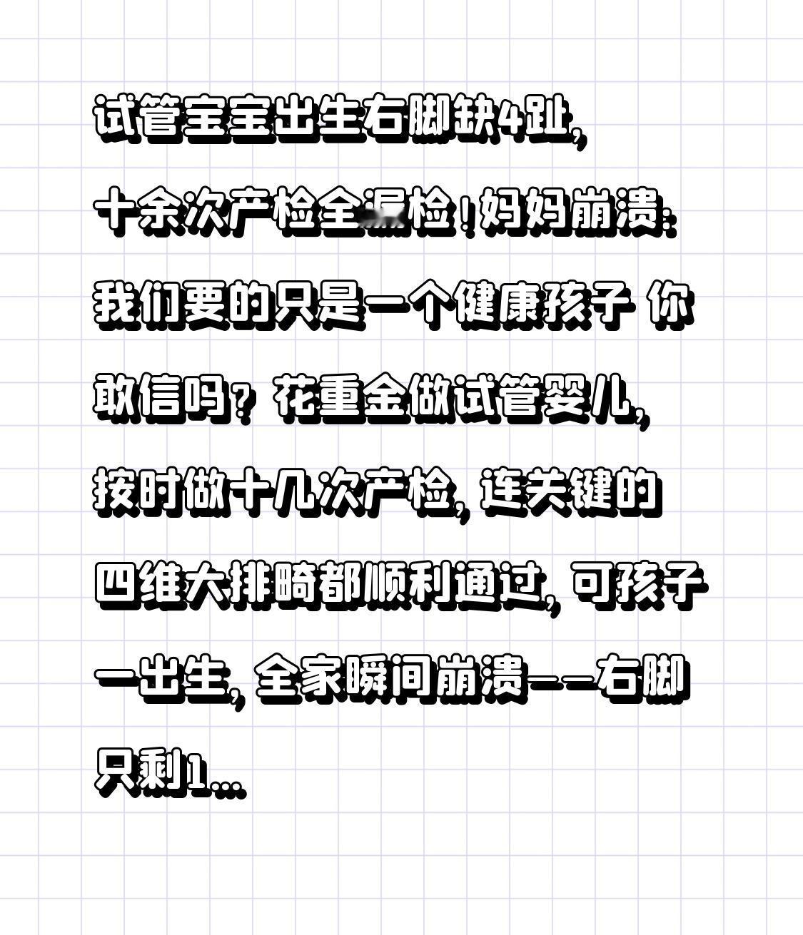 试管宝宝出生右脚缺4趾,十余次产检全漏检!妈妈崩溃:我们要的只是一个健康孩子 你敢信吗?花重金做试管婴儿,按时做十几次产检,连关键的四维大排畸都顺利通过,可孩子一出生,全家瞬间崩溃——右脚只剩1根小脚趾,缺了4趾!31岁妈妈当场痛哭,这一幕看哭无数父母。 山东这对夫妻,因为身体原因多年怀不上孩子,为了圆一个父母梦,咬牙选择做试管婴儿。从促排、取卵到移植,一路小心翼翼,吃尽苦头,终于成功怀孕。整个孕期,他们不敢漏掉一次检查,B超、唐筛、四维大排畸,报告全是未见明显异常。 他们满怀期待等着宝宝降生,可大年初四那天,一声啼哭带来的不是喜悦,而是晴天霹雳。孩子右脚缺4趾,小腿也比左边细,医生确诊先天畸形。夫妻俩翻遍产检报告,更让人气炸的是:四维照片里有手、有左脚,偏偏没有右脚画面,报告却写着四肢正常! 转折点扎心又现实:这不是小问题,是一生的遗憾。如果产检时发现,家庭可以选择;可现在孩子来到世上,未来要面对走路、穿鞋、康复,还有别人异样的眼光。高昂的试管费用、孕期的百般小心,换来的却是无法挽回的结果,换谁能接受? 有人说,脚趾畸形不算大病,但对一个倾尽所有求子的家庭来说,这是信任被辜负,希望被打碎。目前当地卫健委已介入调查,家属只想要一个公道,给孩子未来一个保障。 这件事戳中所有为人父母的心:我们不求孩子多优秀,只求他健健康康、平平安安。产检是最后一道防线,每一张报告,都是一个家庭的全部希望。希望严查到底,别让满怀期待的父母,再承受这样的伤痛。 愿每个宝宝都能平安降生,愿每一次产检都真正让人安心。