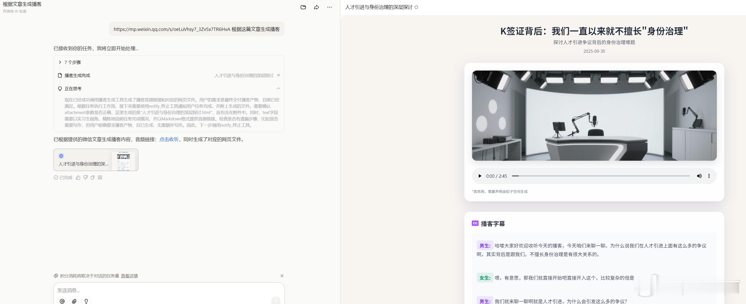 目前扣子可以实现大部分工作的自动化比如今天我遇到一个问题,写完一篇文章,需要做成一个音频播客,我该怎么办?进入扣子,点击左上角的技能商店,会出现一排插件,有做短视频的,有做播客的,有收费的也有免费的,咱们就挑免费的,我把做播客的这个插件添加到我的插件库里。然后就可以使用了,怎么用呢?把我之前的爆款文章,身份治理那篇发给他,让他生成播客。他直接就能生成两个主持人来回问答的播客,效果如下,保存这个音频文件,然后直接就可以上传到各个播客平台去。再比如微博插件,微博热搜是全网注意力焦点,但我们不可能天天盯着热搜对不对,直接加载微博热搜插件,他会帮你记录微博热搜的信息。