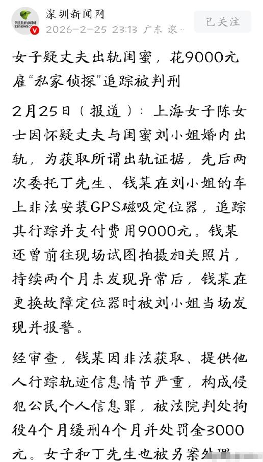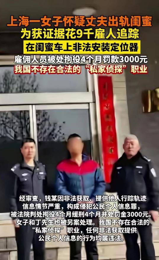 上海,女子怀疑,丈夫和自己的闺蜜有一腿,为了拿到实锤证据,她花了9千多块钱,雇了一个私家侦探,在闺蜜车上装了定位器,随时追踪。但几个月下来,一点有用的东西都没拍到不说,定位器还突然坏了。侦探冒险爬入车底更换,谁知,被闺蜜逮个正着。这下,抓人被抓着,把自己送进去了。   事件的主人公是陈女士,她与丈夫结婚多年,曾经的热烈感情渐渐褪去,日子过得平淡而平淡。   平淡的生活里,不安的种子悄然发芽,陈女士总觉得丈夫变了,回家的时间越来越晚,手机常年不离手,对自己的态度也愈发冷淡,那份曾经的温柔与体贴,似乎越来越远。   这种不安不断发酵,最终变成了无端的猜忌,而猜忌的矛头,竟然指向了她最要好的闺蜜刘小姐。   说起来令人惋惜,刘小姐能进入陈女士丈夫的公司工作,还是陈女士好心引荐的。   可也正是因为这层关系,两人往来变得频繁,在陈女士眼中,这份正常的往来,却成了“不正当关系”的蛛丝马迹。   她越看越觉得两人之间有猫腻,越想心里越不踏实,多次主动找丈夫和闺蜜对质,可每次都没能得到自己想要的答案,反而让内心的猜忌愈发强烈,彻底陷入了自我脑补的漩涡之中。   被猜忌冲昏头脑的陈女士,没有选择坐下来好好沟通,没有尝试用理性化解疑虑,反而一门心思想要找到“实锤证据”,想要戳破自己脑补的不堪画面。   或许是受影视剧的影响,她竟荒唐地想到了雇佣“私家侦探”这条捷径,天真地以为只要花点钱,就能拿到自己想要的证据,彻底了却心头的疑虑。   经朋友牵线,陈女士找到了自称能提供“私家侦探”服务的丁先生,又通过丁先生联系到了钱某,三方当场谈妥,陈女士先后支付了9000元费用,委托两人帮忙跟踪闺蜜刘小姐,查清她与自己丈夫之间是否存在不正当关系。   收了钱的丁先生和钱某,立刻行动了起来,他们选择了一款磁吸式的GPS定位器,这种定位器无需接线,隐蔽性极强,只需吸附在车辆底部,就能实时获取车辆的行踪轨迹。   趁着刘小姐不注意,钱某先后两次悄悄将定位器安装在她的车上,从那以后,刘小姐开车去了哪里、走了哪条路、在哪里停留,陈女士都能通过手机实时查看,一举一动尽在掌握。   除此之外,钱某还专门跑到刘小姐常去的地方蹲守,试图拍下两人独处的“实锤”照片,可日复一日,整整跟踪了两个月,他们没有发现任何异常,刘小姐的生活轨迹正常,与陈女士丈夫之间,也只是正常的同事和朋友往来,没有任何越界的行为。   两个月的跟踪一无所获,陈女士心里既失望又不甘,曾经一度打算收手,放弃这场没有意义的调查。   可就在这时,安装在刘小姐车上的定位器突然出现故障,彻底断了陈女士的监视渠道。   钱某想着拿人钱财、替人消灾,不愿半途而废,便趁着夜色,偷偷跑到刘小姐停车的地方,蹲在车边准备更换新的定位器。   可他万万没有想到,就在他蹲在车底捣鼓设备的时候,刘小姐正好下楼取车,一眼就发现了车底的人影,当场将钱某堵住,又惊又怒的她,没有丝毫犹豫,立刻拨打了报警电话。   警方赶到现场后,当场控制住了正在操作的钱某,顺着这条线索深挖下去,很快就锁定了幕后主使陈女士,以及帮忙牵线的丁先生,三人的违法操作被一一坐实,这场由猜忌引发的违法闹剧,也彻底败露在阳光之下。   警方调查确认,陈女士雇佣丁先生、钱某,在刘小姐车辆上私自安装GPS定位器,长期追踪其行踪轨迹,属于非法获取公民个人信息的行为;   丁先生、钱某受雇实施安装、更换定位器、蹲点跟踪等行为,属于共同非法获取与提供公民个人信息,三人的行为均已构成侵犯公民个人信息罪。   最终,法院依法作出判决,钱某因侵犯公民个人信息罪,被判处拘役4个月,缓刑4个月,并处罚金3000元;   幕后主使陈女士和协助牵线的丁先生,也被另案处理,等待他们的,同样是法律的公正审判。   而刘小姐,自始至终都是这场闹剧里无辜的受害者,她的正常生活被无端打扰,个人隐私被肆意侵犯,选择报警维权,完全合情合理,无可厚非。   这起事件没有狗血的反转,没有意外的惊喜,只有一步错、步步错的荒唐与遗憾。   陈女士为了一场无端的猜忌,花费9000元,不仅没能拿到任何证据,反而触犯了法律,毁掉了自己的生活,也伤害了曾经亲密的闺蜜,牵连了他人,这样的结局,看似意外,实则必然。   生活中,我们难免会遇到情感上的疑虑和困扰,但无论多么委屈、多么不安,都不能突破法律的底线,不能用违法的手段去寻求所谓的“真相”。   猜忌从来都不是解决问题的办法,沟通与理性,才是化解矛盾、守护关系的关键,一旦被猜忌冲昏   今天的分享到这里就结束了,大家对此事有何看法,欢迎在评论区留言和讨论,感兴趣的可以点击头像加关注,我将每日更新优质内容,我们下期见。