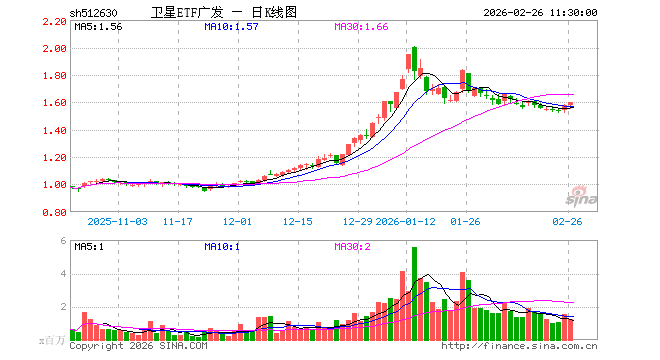 2月26日,截止午间收盘,卫星ETF广发(512630)涨1.33%,报1.597元,成交额1.94亿元。卫星ETF广发(512630)重仓股方面,中国卫星截止午盘涨1.95%,航天电子涨1.80%,中国卫通涨1.27%,中科星图涨3.05%,臻镭科技涨1.13%,华测导航涨1.31%,北斗星通涨0.74%,国博电子涨3.32%,北方导航跌0.06%,新雷能涨1.70%。