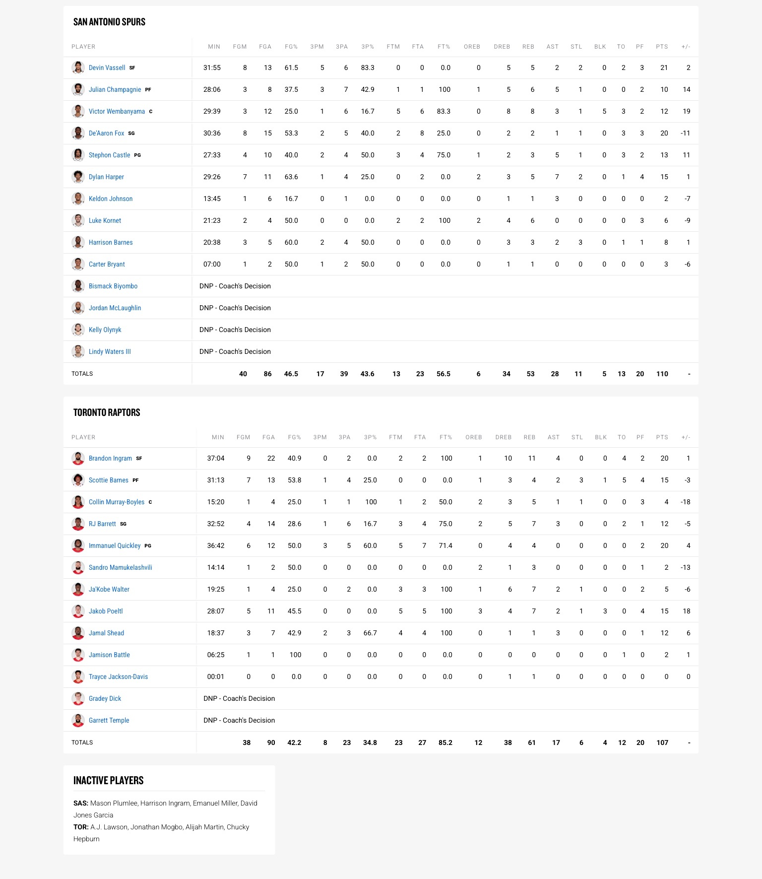 马刺(42-16):瓦塞尔21分5板2助2断、福克斯20分2板1助、哈珀15分5板7助2断、卡斯尔13分3板5助、文班亚马12分8板3助5帽、尚帕尼10分6板5助、巴恩斯8分3板2助3断、科内特6分6板、布莱恩特3分1板、凯尔登2分1板3助