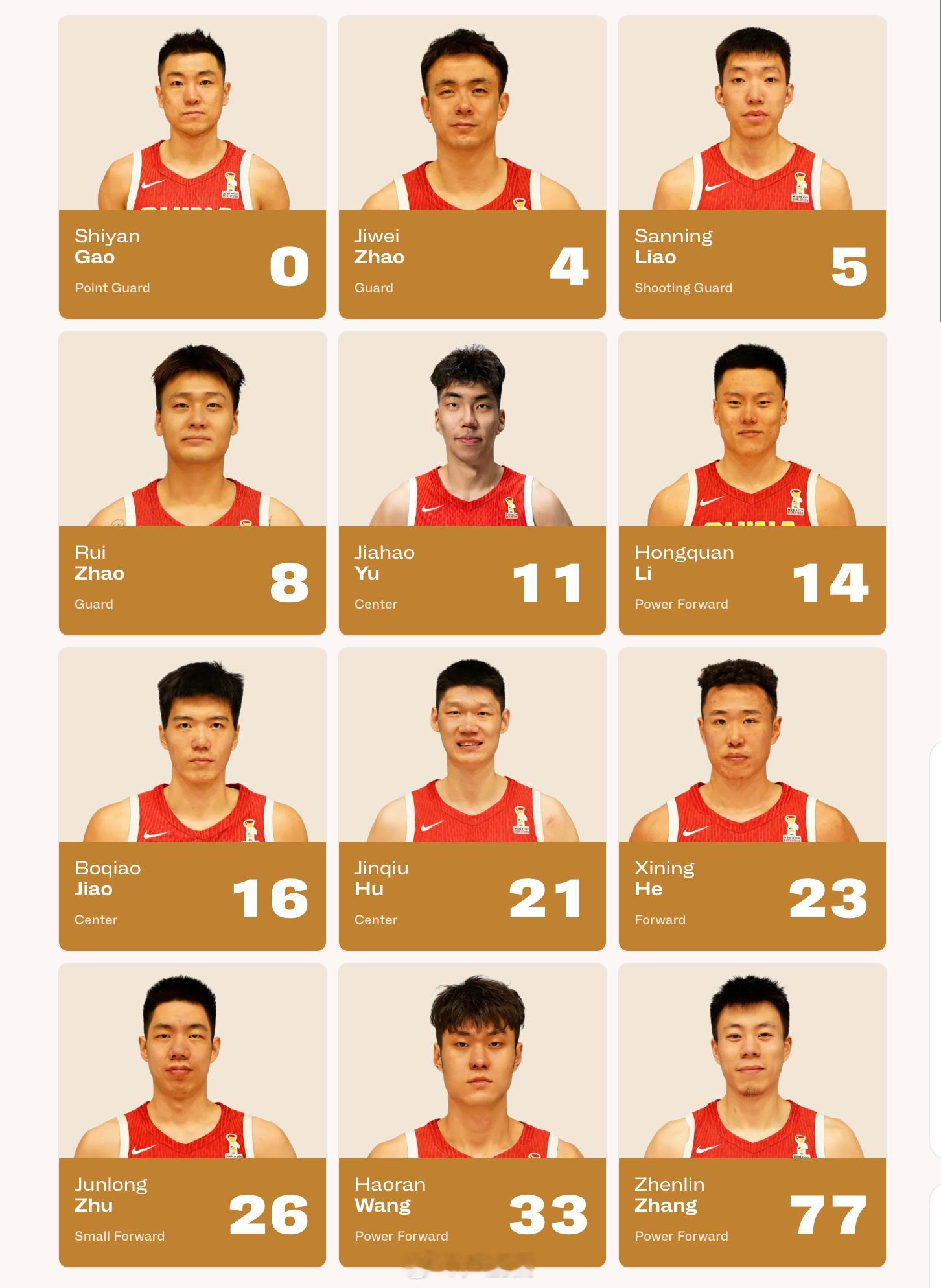 后卫:赵继伟、赵睿、廖三宁、高诗岩、贺希宁锋线:李弘权、朱俊龙、王浩然、张镇麟内线:胡金秋、焦泊乔、余嘉豪