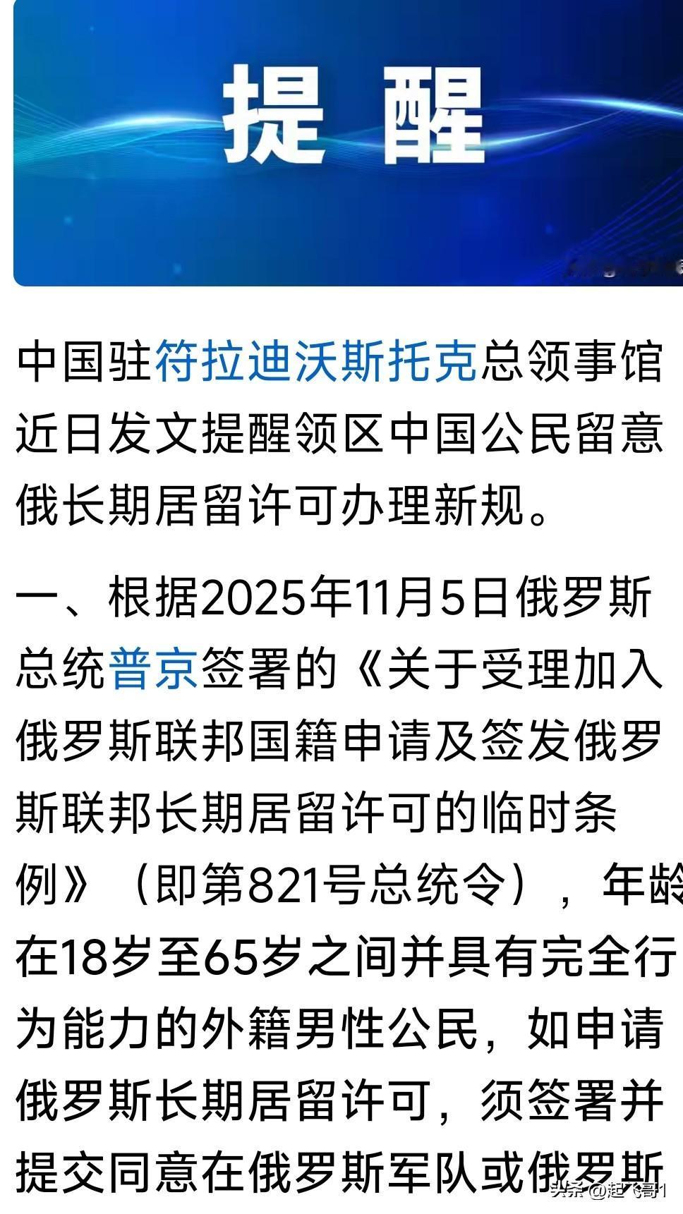 这一下就能看出来,俄罗斯兵源紧张了,兵源紧张就证明俄罗斯这几年和乌克兰战争带来的伤害,俄罗斯男人不够用了。 俄罗斯把手伸向外籍男性公民了,根据2025年11月5号俄罗斯总统普京签署《关于受理加入俄罗斯联邦国籍申请及签发俄罗斯联邦长期居留许可的临时条例》(既821号总统令),18-65周岁的男性公民想在俄罗斯居留,都必须到俄罗斯部队服役至少一年。 以后想拿到俄罗斯国籍的外国公民都必须有俄罗斯联邦军队或者俄罗斯兵役机关提供在俄罗斯服役证明才能拿到俄罗斯国籍或者长期居留证。 18-65周岁俄罗斯部队都要,俄罗斯这招是不是要抓或者驱离更多的间谍呢,60多岁了能去部队干什么,这是俄罗斯驱离在俄罗斯国内的境外间谍,让他们无处藏身。要不然就去俄罗斯部队服役去吧。服役完事才给你们遣送回国。