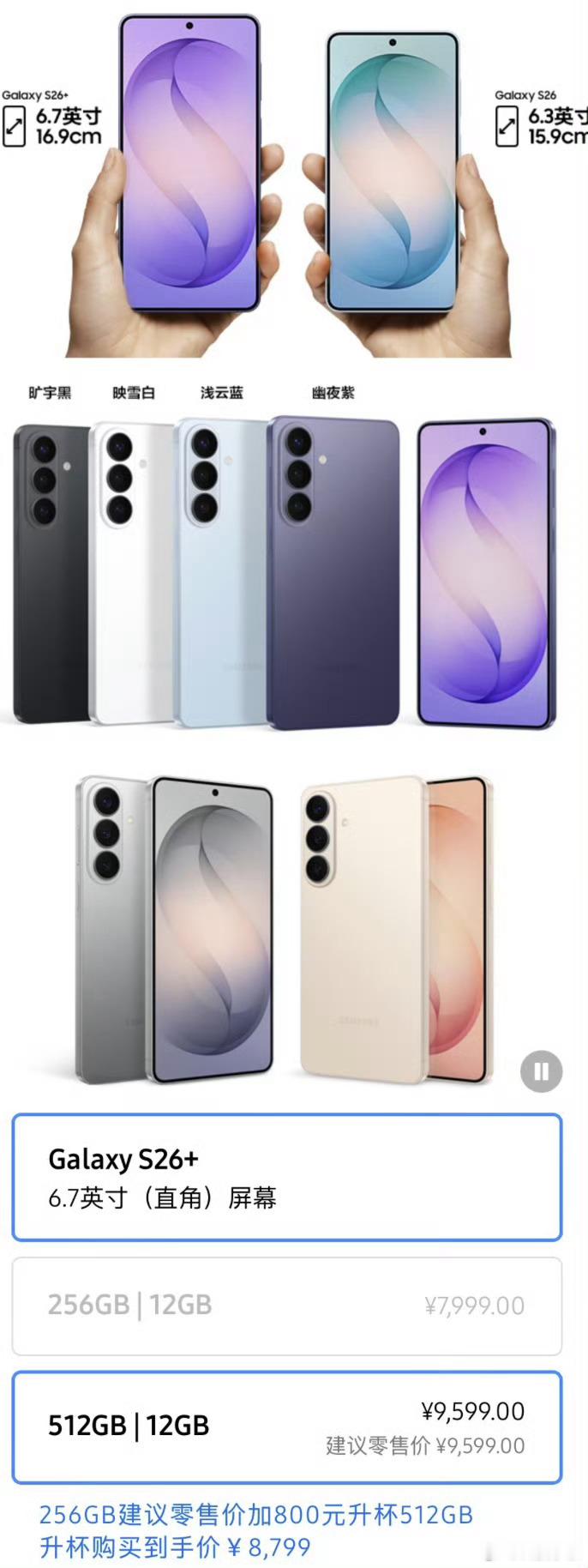 三星GalaxyS26系列价格来了! -S26: 12+256G 6999 -S26+: 12+256G 7999 12+512G 9599 -S26 Ultra: 12+256G 9999 12+512G 11599 16+1T 13999 相较上一代,这次S26全系基本涨价1000左右,但甭管什么价格,大家身边还有在用三星手机的小伙伴吗?有点东西