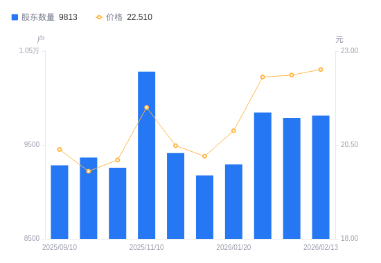 日期A股户数(户)流通A股户均持股数(股)户均持股市值(万元)2026-02-13981316091.9936.222026-02-10978716134.7436.082026-01-31984616038.0535.782026-01-20929216994.2635.482026-01-10917517210.9734.772025-11-30941416774.0334.352025-11-101028215343.4032.992025-09-30925817040.4934.252025-09-20936616843.9933.352025-09-10928316994.6034.63