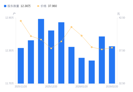 日期A股户数(户)流通A股户均持股数(股)户均持股市值(万元)2026-02-201238004885.0818.542026-02-101256004815.0718.152026-01-311212004989.8818.982026-01-201217004969.3819.772026-01-101237004889.0320.092025-12-311282004717.4218.362025-12-201267004773.2718.072025-12-101288004695.4418.412025-11-301249004842.0619.232025-11-201235004896.9520.59