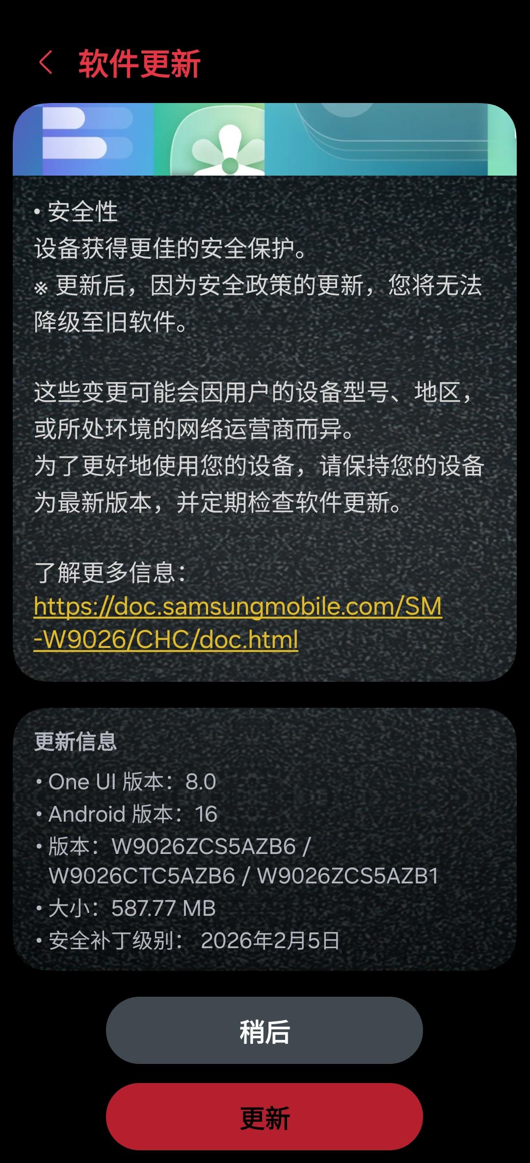 刚刚三星手机w26收到系统安全策略更新,我没有更新心想再等8.5吧,这种更新没有