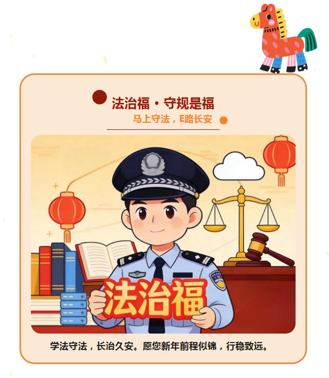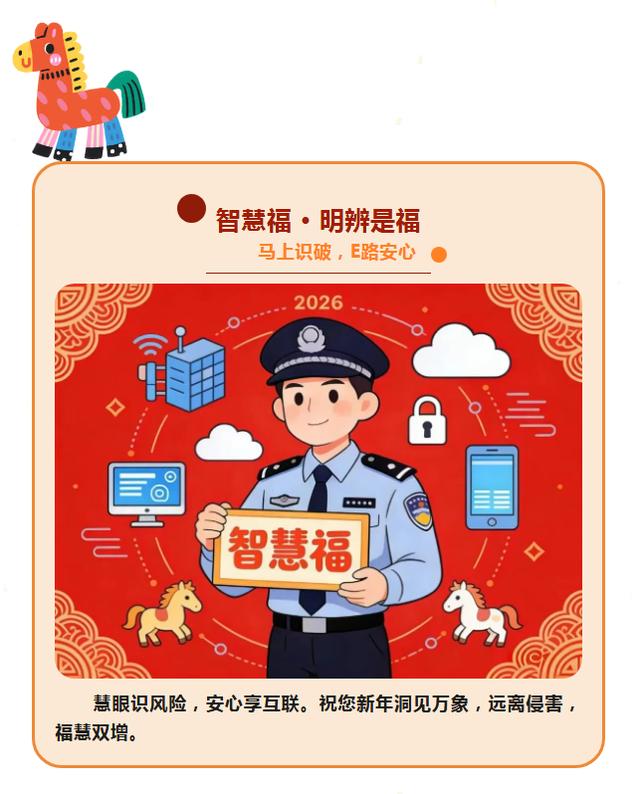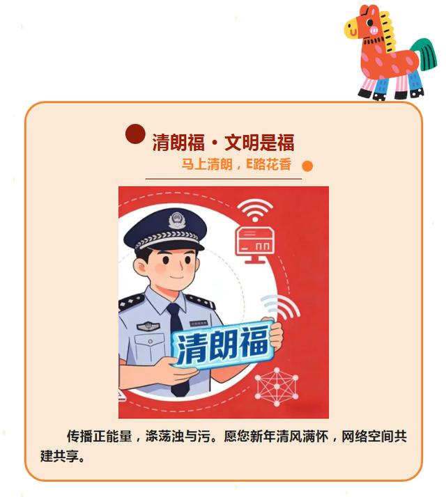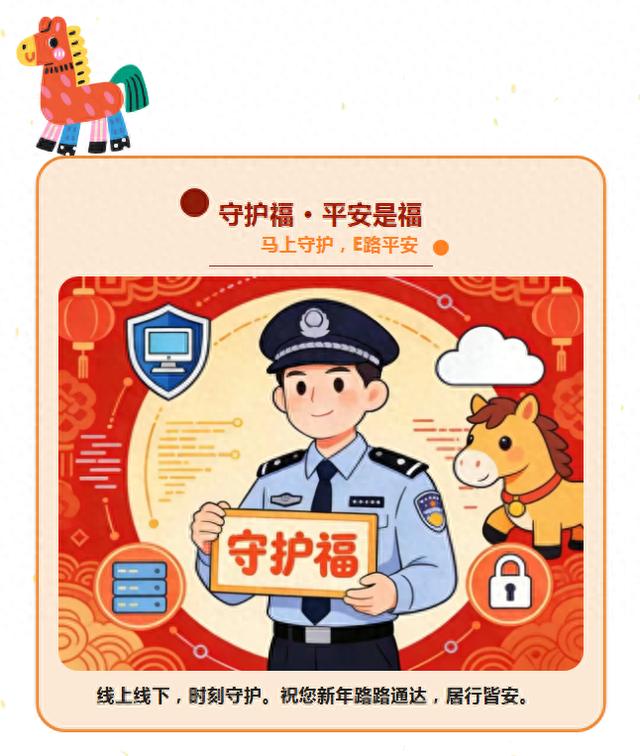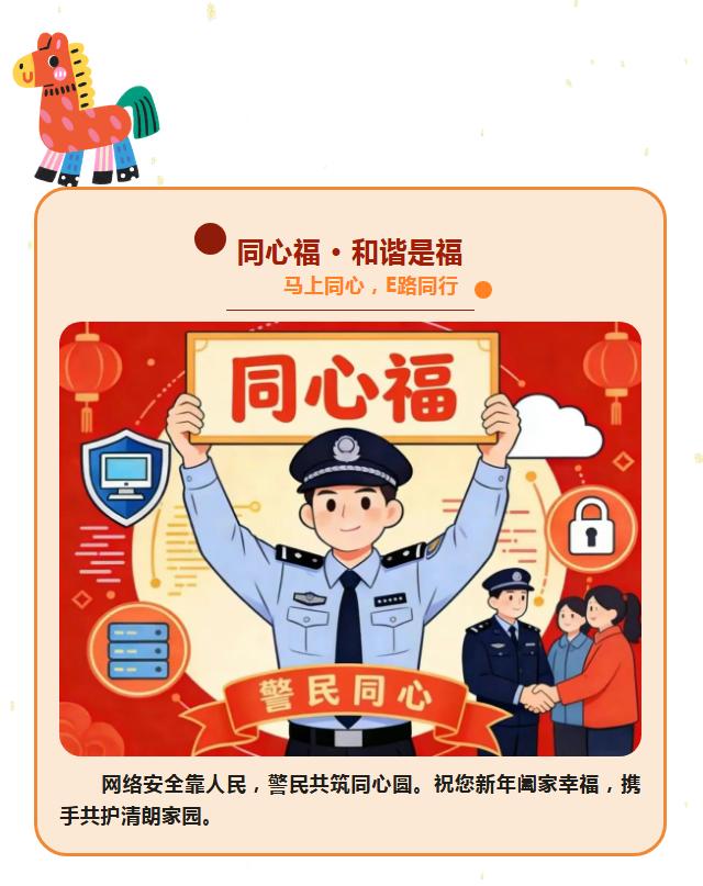 新春之际,网警诚邀广大网民朋友共同传递网络安全“五福”,“马”上行动,E路顺遂。从自身做起,汇聚点滴力量,共筑清朗、安全、温暖的数字家园。