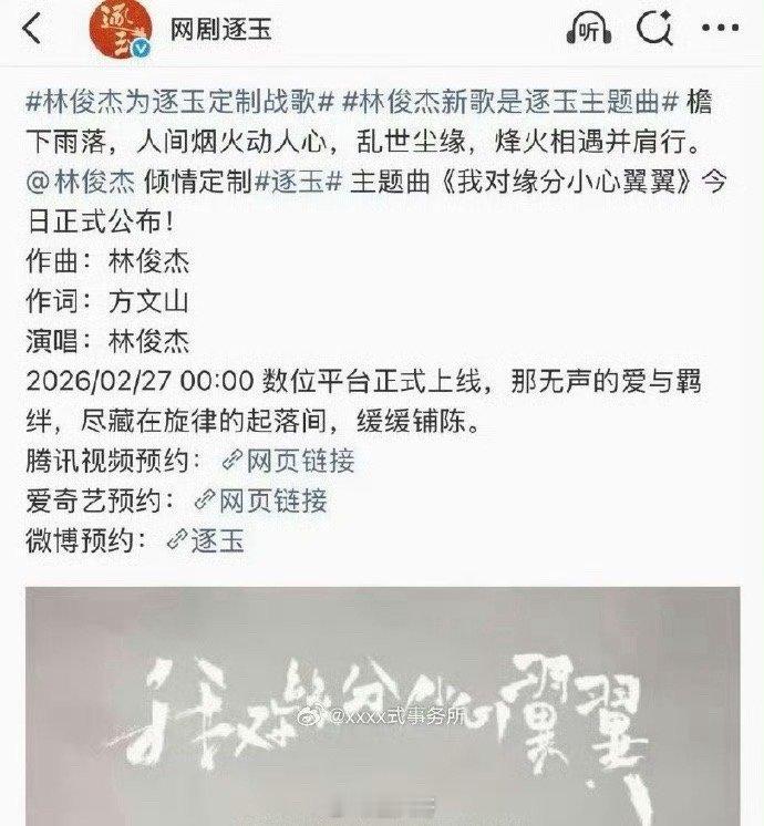 网剧逐玉官宣林俊杰哇塞,终于等来网剧《逐玉》官宣林俊杰了啊,林俊杰倾情定制张凌赫、田曦薇新剧《逐玉》主题曲。就是说《逐玉》这个阵容绝了吧,有田曦薇和张凌赫。还有林俊杰方文山,果真是未播先火啊~林俊杰倾情定制逐玉主题曲