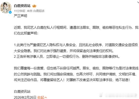 白鹿方抵制跟车跟踪偷拍白鹿方抵制跟车声明白鹿方发声抵制跟车、跟踪、偷拍!请把热情留在阳光下,把隐私还给艺人。