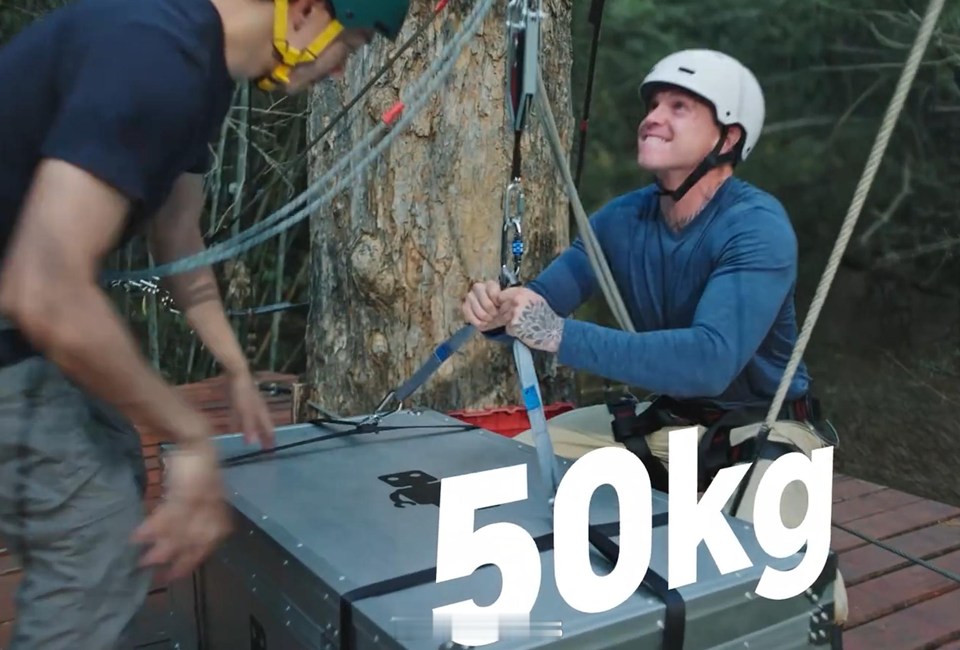 荣耀 Magic V6 的铰链这次依旧很顶,先吊 25kg 背包,再挂 50kg 设备,最后直接让 80kg 的人挂着滑索,承重能力很稳。
