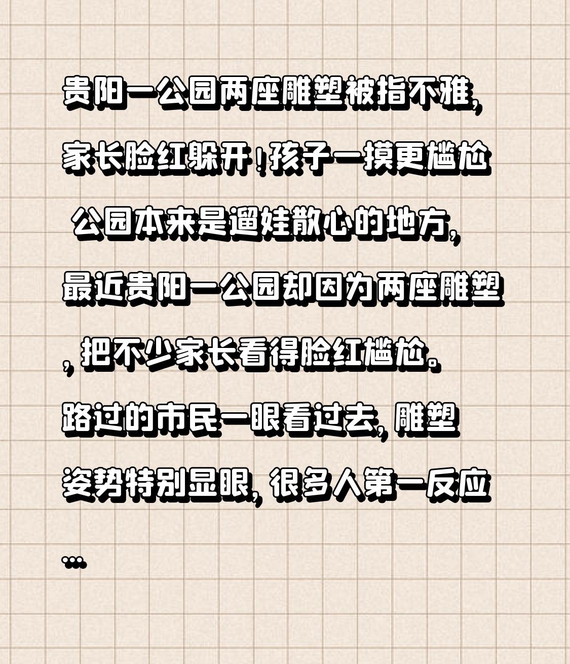 贵阳一公园两座雕塑被指不雅,家长脸红躲开!孩子一摸更尴尬 公园本来是遛娃散心的地方,最近贵阳一公园却因为两座雕塑,把不少家长看得脸红尴尬。 路过的市民一眼看过去,雕塑姿势特别显眼,很多人第一反应就是:这造型也太不雅了吧!尤其是带孩子的家长,根本不敢让孩子多看,生怕问起来不知道怎么解释。 更让人无奈的是,不少小朋友不懂艺术,跑到雕塑旁边攀爬、触摸,专门往敏感部位摸,现场画面让人极度不适,家长只能赶紧把孩子拉走,又尴尬又无奈。 本以为就是设计低俗,可转折来了。 记者实地探访才知道,这两座雕塑名字叫独处之境、梦境之境,是公园“七情八景”的一部分,设计师想表达的是自我对话、内心宁静的艺术理念,没有任何低俗含义。 问题就出在:雕塑旁边没有半个字介绍,普通人看不懂抽象理念,只看姿势,自然往不雅方向想。好好的艺术作品,因为少一块说明牌,硬生生被当成“不雅雕塑”。 公园方回应:会尽快加简介牌,把设计理念讲清楚。 其实这事真不怪市民敏感,也不能全怪艺术家。公共艺术不是私人画展,公园是老人孩子都来的地方,既要讲美感,也要接地气、顾体面。 艺术可以高冷,但不能让大众猜谜;设计可以抽象,但不能让家长尴尬、让孩子模仿。好的公共景观,是好看、好懂、舒服,而不是争议不断。 也希望以后公园、景区在做景观设计时,多站在普通人角度想一想,少点高冷抽象,多点直白温暖,别再让“艺术”变成“误会”。 公共空间,美观得体,才是真的好风景。