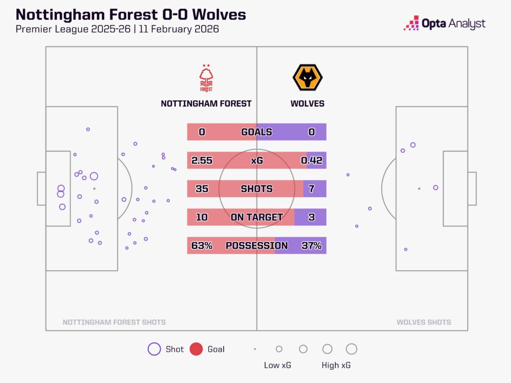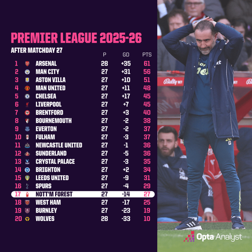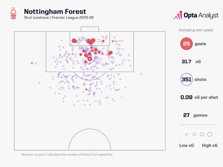 本赛季英超联赛27场比赛过后,诺丁汉森林只进了25个球;只有狼队的进球数比他们更少(18个)。