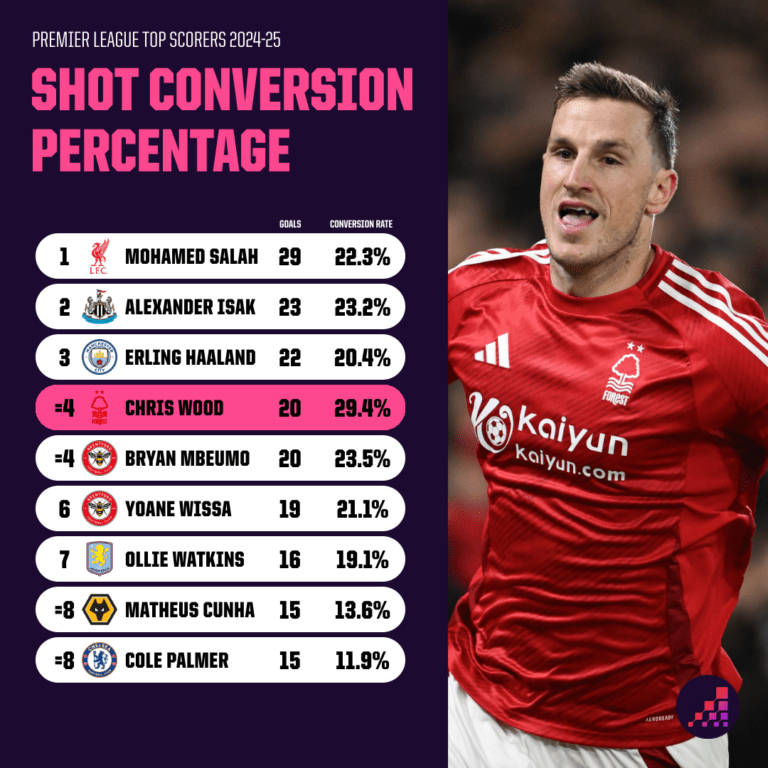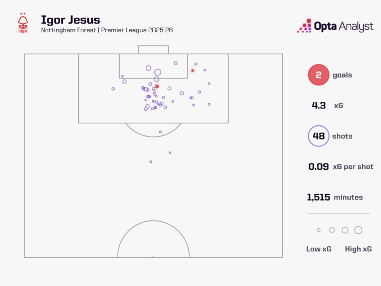 相比之下,本赛季英超联赛中,森林队所有至少尝试过20次射门的球员中,没有人的射门转化率高于11.1%(哈德森-奥多伊)。