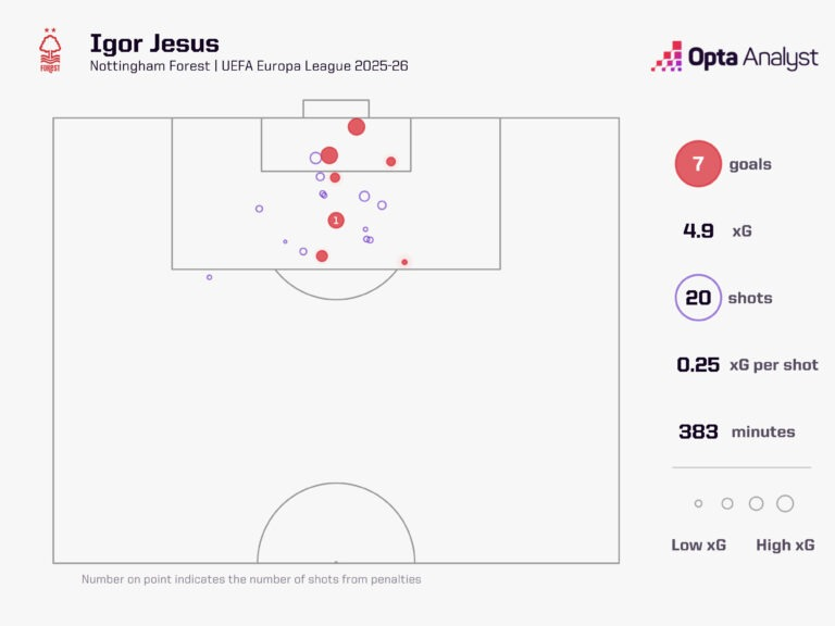 不过,他在欧联杯中获得了更多机会,进球转化率高达35%。他在英超联赛中每次射门的预期进球数(xG)为0.09,而欧战中则为0.25。尽管欧联杯7场比赛中包含一粒点球,但热苏斯在欧联杯7场比赛中的20次射门的预期进球数(4.9)仍然高于他在英超联赛26场比赛中的48次射门的预期进球数(4.3)。