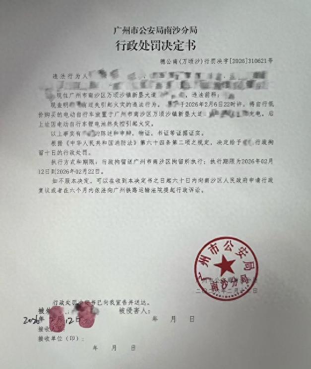近日,广州南沙区一男子因其电动自行车不规范停放充电引发火灾,被行政拘留10日。