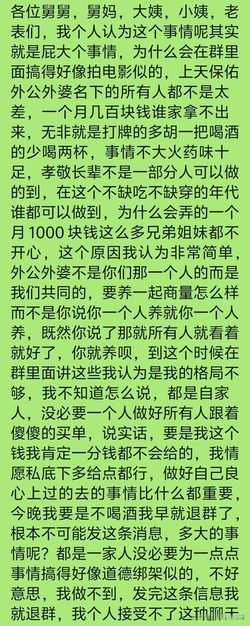 关于两位老人的养老问题引发的战争 先介绍一下背景:在江西来说,父母年轻时帮扶儿子,所以儿子承担赡养老人义务,女儿逢年过节包过节费。一对夫妻,来自江西抚州东乡白干镇,男94岁,女88岁,育有7个子女,大儿子+中间5个女儿+小儿子,大儿子年近70,打零工,育有两子,家庭条件较差;大女儿育有一子,中年丧夫,儿子离婚带两儿一女,大姨个人特别努力赚钱,家庭条件一般,但有房有车;二女儿育有一儿一女,家里在广东做家具生意,生意日渐没落,但是瘦死的骆驼比马大,开百万豪车;三女儿育有两子,均已婚,二儿子娶妻彩礼近百万,导致掏空家底;四女儿育有一儿一女,家境中上;五女儿育有两儿一女,家境中上,女儿因计划生育,两位老人家曾带4年;小儿子中年出轨后离婚,与小三再婚,育有两儿两女,目前在东莞开理发店,家境一般。 2025年春节期间,几个女儿提出让两个儿子开始承担赡养责任,大儿子说愿意承担赡养义务,一人服侍一个月,小儿子未表态,同时两个老人认为自己行动自如,可以自己照顾自己,所以赡养的事情不了了之。 2026年春节前,男老人已经出现老年痴呆症状,几位女儿正月初二再次提出赡养老人问题,小儿子表示要在广东开店,没办法在家赡养,让老大帮忙赡养,中午煮一顿饭,自己出1000块钱/月,五女儿表示也出1000块钱/月,小儿子表示不用女儿出,儿子管就行!大儿子当场没有表示异议,自此大家以为赡养问题得到解决! 正月初九,大家均已外出打工,大儿媳表示1000块钱/月不够,一直以为是2000块钱/月,五女儿表示自己出1000块钱/月,五女婿表示又不是一个女儿,应该与几个姐姐协商一起!五女儿和二儿子觉得2000块钱只是中午煮一顿饭,钱已经给的很多了!大儿媳得知后明确表示不干了! 五女儿紧急找同村人照顾,同村人表示大儿子在家,给钱也不能干!五女儿哭着找女儿,其女儿明确告知,2000块钱在家照顾两个老人确实不够,大儿子不仅仅要煮饭,一个月生半个月病也要带去看病,而后在家族群发了以上2段内容,约定具体时间商议。晚上商议时,除了五女儿,四女儿认为赡养老人是儿子的事情后离开,其他女儿不出面!大儿子明确表示两个儿子一人搞一个月,并且口头表示可以先搞,但是不帮小儿子服侍,给2000块钱也不干!小儿子表示出力做不到,自己能力有限,只能出1000块钱/月,最终无法达成一致意见!半个小时后,二女儿的儿子发出来以上一大段文字!以上问题如何破解,还请各大网友帮忙出出主意