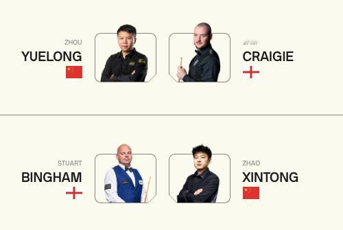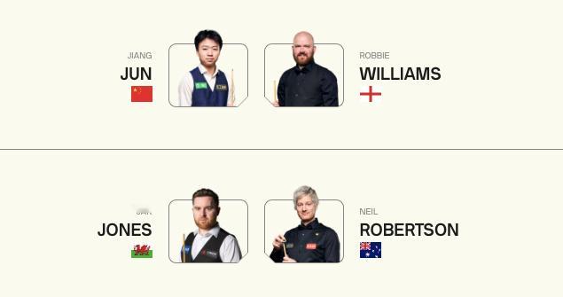 江俊VS罗比-威廉姆斯吴宜泽VS大卫-格雷斯张安达VS约翰-希金斯周跃龙VS山姆-克雷吉赵心童VS斯图尔特-宾汉姆