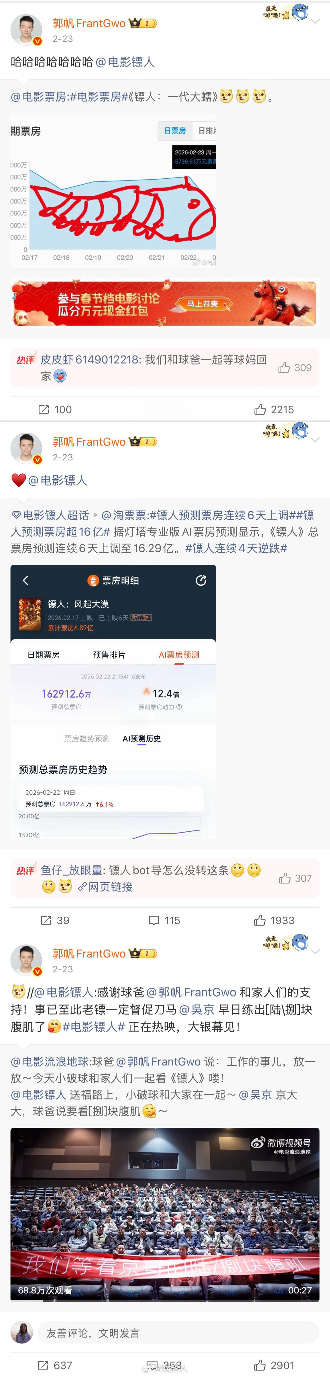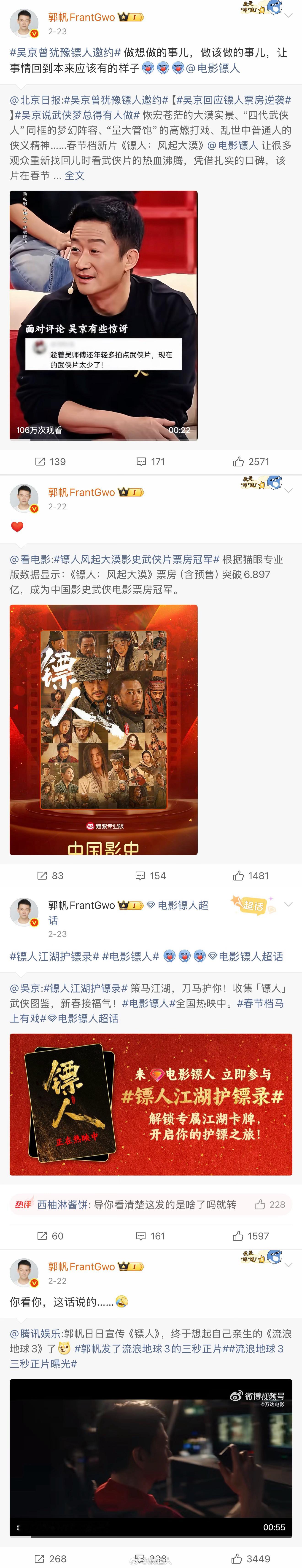 翻了一下郭帆ls的微博,“含镖量”有点太高了!从电影口碑到海外评价到路演、评分、喜报,全方位转发!在纪录片里还看到郭帆ls冒着60度高温去组里探班,和吴京同框的画面真是别太好磕了有理由怀疑郭帆已经被吴京迷得不知天地为何物了,球爸原来是京脑来的~