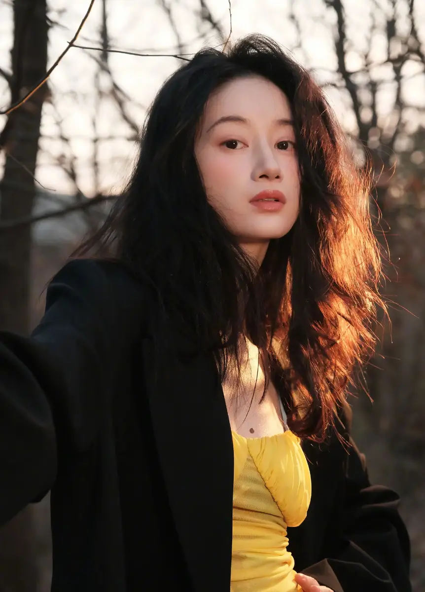 郭晓婷穿吊带黄裙搭配黑西装优雅大气 林间漫步气质温婉