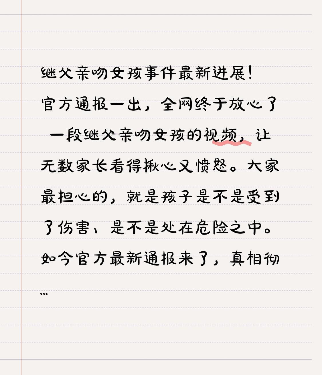 继父亲吻女孩事件最新进展!官方通报一出,全网终于放心了 一段继父亲吻女孩的视频,让无数家长看得揪心又愤怒。大家最担心的,就是孩子是不是受到了伤害、是不是处在危险之中。如今官方最新通报来了,真相彻底清晰,结局让人松了一口气。 视频里,继父对女孩做出搂腰、亲吻等亲密动作,孩子明显抗拒,看着就让人心疼。视频一曝光,立刻引爆全网,网友纷纷喊话:必须严查!保护孩子!很多人猜测,孩子是不是长期被欺负,是不是遭遇了侵害,越想越害怕。 就在全网揪心等待时,官方通报带来关键转折。 内蒙古妇联与警方联合核查:涉事男子是女孩继父,今年1月才和女孩母亲领证结婚;视频是家庭拍摄,母亲当时就在场;警方当面询问女孩,确认没有发生性侵、虐待等实质侵害,孩子身体和精神状态都正常。 更让人欣慰的是,女孩早就主动联系亲生父亲,春节前已被生父从河北接回包头。目前,生父已明确要通过法律变更抚养权,妇联将提供法律援助,全程守护孩子。涉事继父的社交账号也已被限制,内容无法查看。 虽然继父的行为越界、不合适,母亲监护失职,都该被批评教育,但万幸的是,孩子没有受到实质伤害,并且已经脱离了让人不安的环境,回到亲生父亲身边。 这件事也给所有家庭敲响警钟: 重组家庭更要注意边界感,异性长辈和孩子相处必须有分寸;孩子表现出抗拒、不舒服,大人一定要立刻停止;监护人的第一职责,是保护孩子,而不是视而不见。 孩子的安全感,比什么都重要。愿每个孩子都能在安全、有边界、被尊重的环境里长大,愿所有伤害都被提前制止,愿每一个幼小的心灵,都能被温柔守护。