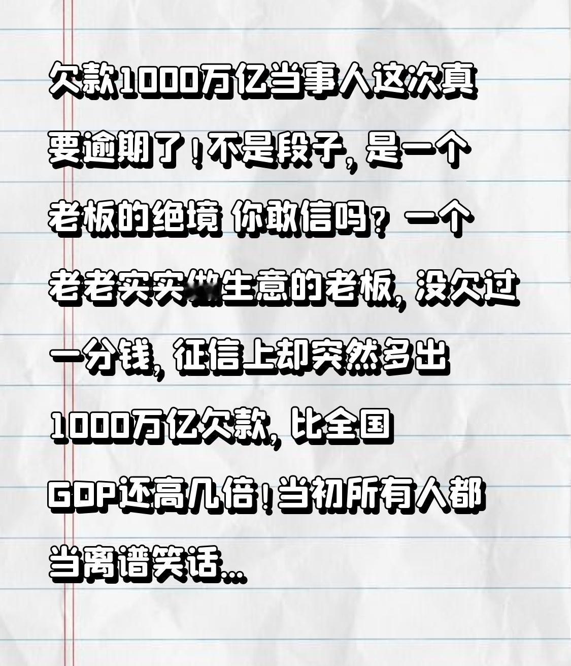 欠款1000万亿当事人这次真要逾期了!不是段子,是一个老板的绝境 你敢信吗?一个老老实实做生意的老板,没欠过一分钱,征信上却突然多出1000万亿欠款,比全国GDP还高几倍!当初所有人都当离谱笑话看,可如今,笑话变成了悲剧——这位当事人,这次是真的要逾期了! 广东中山的覃先生,开了一家制衣厂,勤勤恳恳十几年,信用卡正常用、贷款按时还,从来没有逾期记录。可2022年,他一查征信直接吓傻:云闪付显示他欠款1000万亿元,直接被标成高危用户。 他懵了,银行也懵了,最后承认是系统错误。可错误能删掉,毁掉的人生却回不来。 因为这条荒唐记录,他整整28个月贷不到一分钱。工厂要进货、发工资、付房租,现金流彻底断裂。为了活下去,他把价值700万的货物打折甩卖,亏本一半清库存,客户流失、订单减少、规模缩水,硬生生把好好的厂子拖到崩溃边缘。 他找银行要说法,损失超200万,银行却只肯赔3万块。两边来回踢皮球,问题始终没解决。 真正的转折点来了:荒唐的1000万亿没了,可他却要被125万逼到绝路。 2月23日,覃先生一笔125万贷款到期。因为长期被拒贷、资金链早已扛不住,他实在拿不出钱,逾期已成定局。再还不上,工厂将被拍卖,一辈子心血化为乌有。 他哭着说:我从来没逾期过,是系统把我逼成了逾期。 这件事看哭无数打工人和小老板。我们总觉得银行靠谱、征信安全,可一个莫名其妙的BUG,就能压垮一个守法经营的普通人。系统可以纠错,可生意没了、信誉毁了、家庭难了,谁来负责? 1000万亿是假的,绝望是真的;系统错误是偶然,普通人的无助是真实的。 我们努力生活、诚信做人,不是为了被一场意外打垮。希望相关部门能尽快介入,还他一个公道,别让老实人,寒了心。