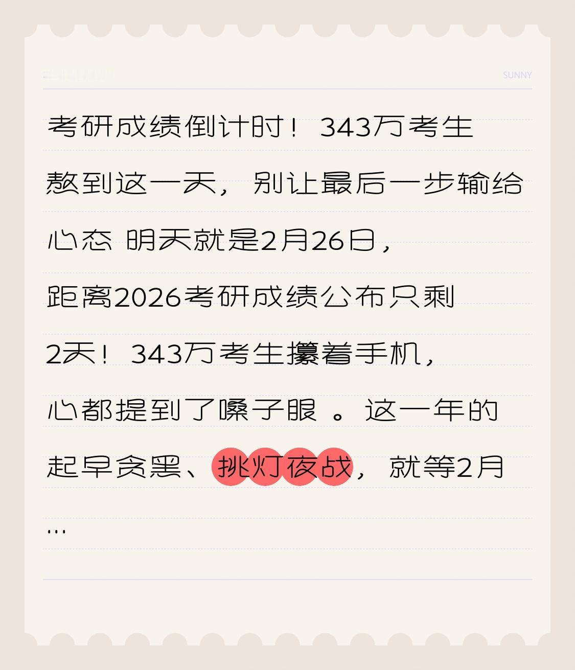 考研成绩倒计时!343万考生熬到这一天,别让最后一步输给心态 明天就是2月26日,距离2026考研成绩公布只剩2天!343万考生攥着手机,心都提到了嗓子眼 。这一年的起早贪黑、挑灯夜战,就等2月28日8点后的那一纸分数 。 你是不是也这样:刷遍了所有查分入口,盯着日历反复看,明明很想知道结果,却又害怕点开屏幕的那一刻。有人把准考证藏了又藏,有人对着书桌前的字帖默默祈祷,那份紧张,比高考还要揪心。 转折来了: 考研不仅考分数,更考心态。哪怕成绩出来不如意,也绝不代表你的人生判了死刑。 记住,每年都有擦线逆袭的人,也有一战失利却二战上岸的传奇。分数只是一个阶段的总结,不是未来的定论。你要做的,不是坐等结果,而是做好两手准备:估分高的,提前备复试;估分不稳的,盯紧调剂通道 。 不要在焦虑中内耗,不要因为等待而荒废。把时间用在刀刃上,练习口语、准备专业课、研究调剂院校,哪怕最终结果不如愿,这些努力也会变成你前行的底气。 父母做好了饭菜,朋友发来鼓励,身后一直有人撑着你。无论结果如何,这段坚持的时光都值得骄傲。人生没有白走的路,每一步都算数。 2月28日,大胆点开那个查询键吧。上岸是最好的礼物,落榜也有重新出发的勇气。 加油,每一个不甘平凡的你,都配得上更好的结局!
