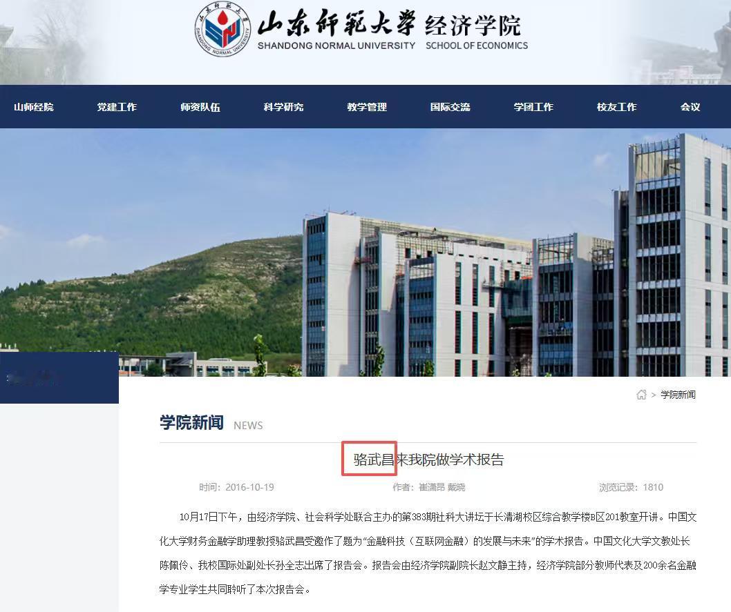 原来,国民党主席郑丽文的丈夫骆武昌2016年10月曾来位于山东济南的山东师范大学作过学术报告! 2016年10月17日下午,由山东师范大学经济学院、社会科学处联合主办的第383期社科大讲坛于长清湖校区综合教学楼B区201教室开讲。台湾中国文化大学财务金融学助理教授骆武昌受邀作了题为“金融科技(互联网金融)的发展与未来”的学术报告。台湾中国文化大学文教处长陈佩伶、山东师范大学国际处副处长孙全志出席了报告会。报告会由经济学院副院长赵文静主持,经济学院部分教师代表及200余名金融学专业学生共同聆听了本次报告会。 当时学校如此介绍骆武昌:骆武昌,中国文化大学财务金融学助理教授,英国南安普顿大学经济学博士,具有多年高等院校任教经验。曾任日盛期货公司研究员、瑞莲财务顾问公司外汇研究员、台北市政府建设局局长机要秘书、大庆票券独立董事等,其主要授课方向为衍生金融商品、货币银行学、行为财务学,目前重点研究选择权波动率及金融科技方向。 郑丽文的丈夫骆武昌,是郑丽文大学期间比郑丽文大一岁的学长,两人2011年10月登记结婚。郑丽文1969年11月出生,两人结婚时郑丽文42岁,骆武昌43岁。
