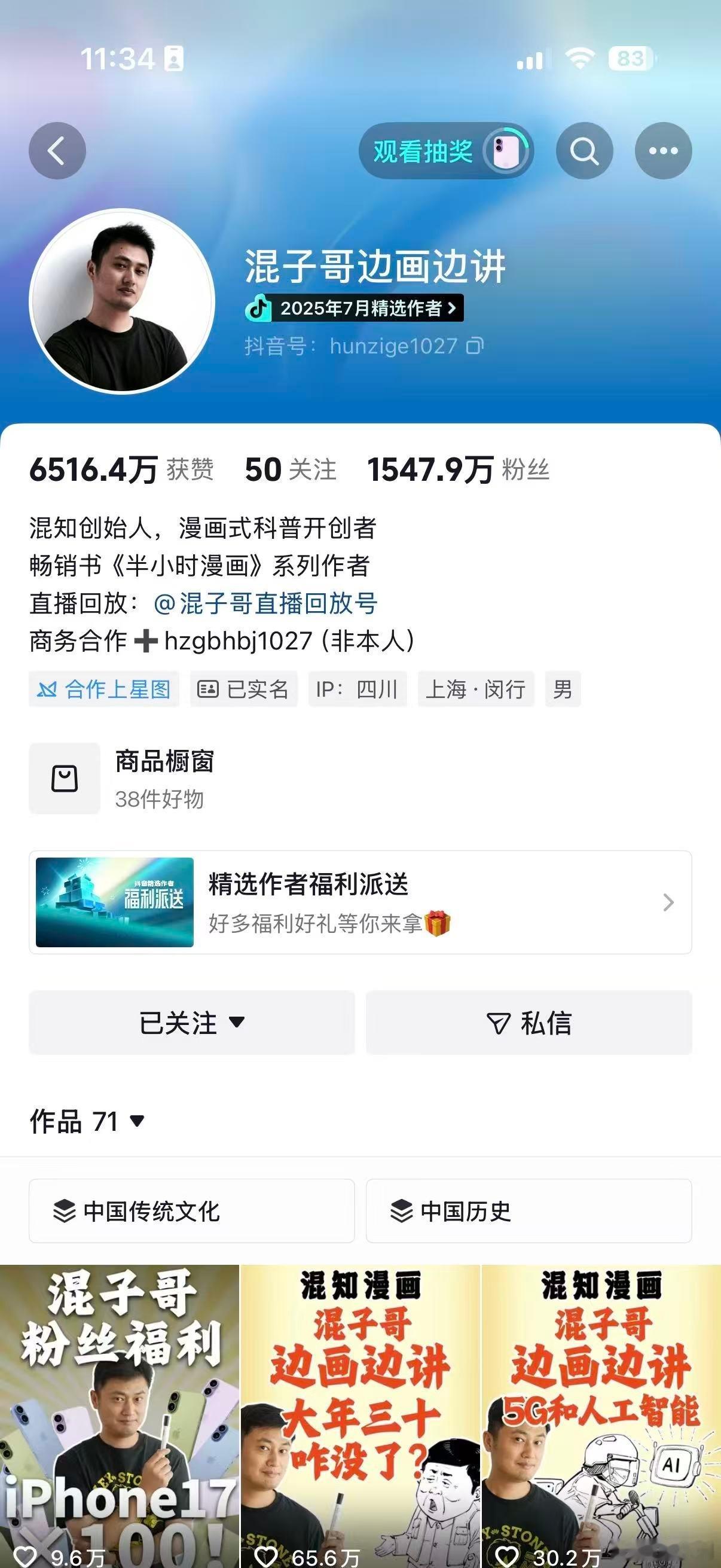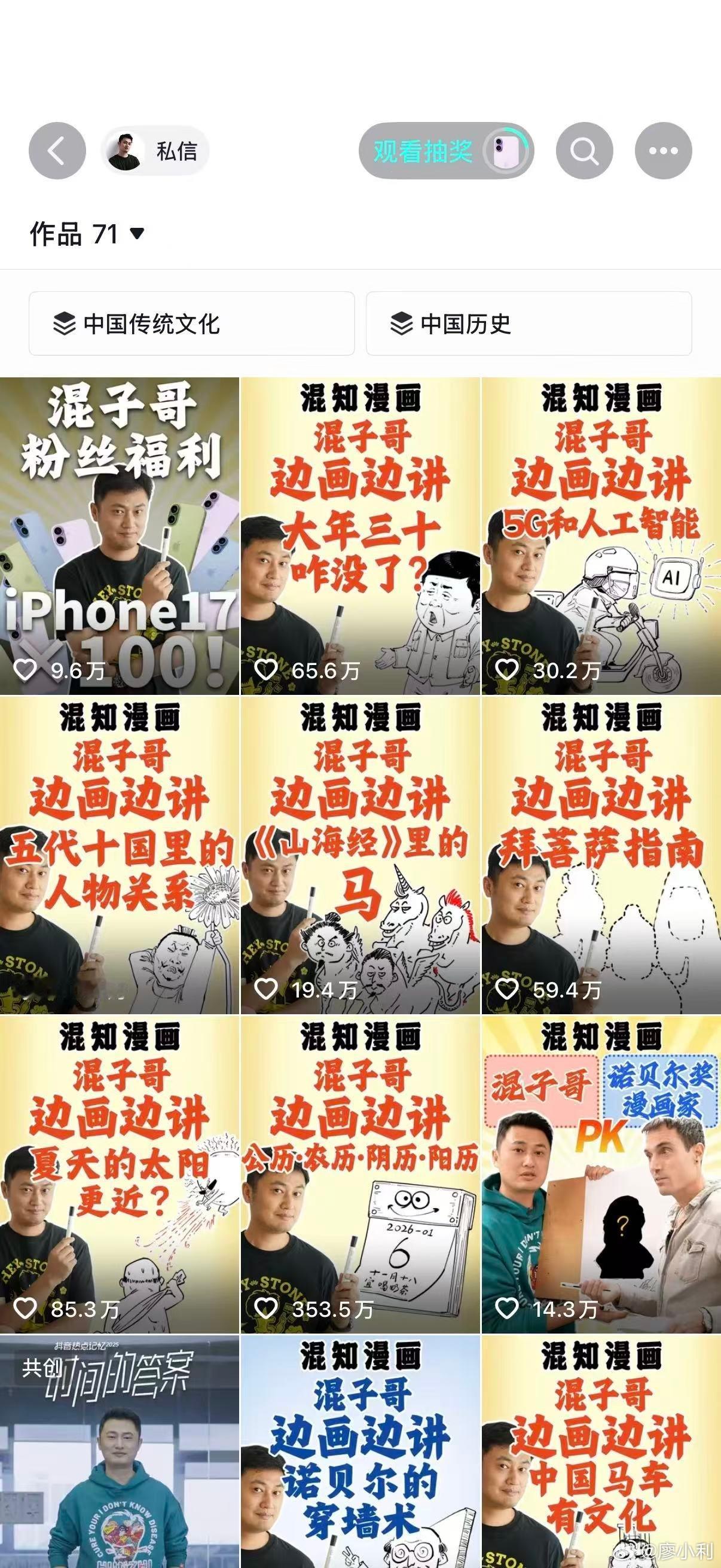 我一直觉得,混子哥那种厉害,不是“会讲”,而是“会拆”。本名陈磊,是“混知”和《半小时漫画》系列的创始人——那套卖了4000多万册的书。很多人以为他是突然在短视频火起来,其实人家早就在知识赛道里深耕很多年了。但他的视频形式真的太有辨识度了。一支笔,一块白板,他本人出镜边画边讲。没有复杂剪辑,没有花里胡哨的包装,就这么把那些听起来就让人头大的东西一点点拆开。“五代十国”那期堪称封神。直接画一朵菊花——花蕊是轮流坐庄的“五代”,花瓣是并存的“十国”。你听完会突然觉得:这么多年历史课,好像都没这张图清楚。《三教九流》更绝,把儒家、道家讲成古代选秀,谁主流谁出道谁“躺平”,一边笑一边记住。《燕云十六州》那期是我个人很爱的一期,他不只是讲历史事实,而是往后推:如果当年没送走,会发生什么?那种逻辑递进的感觉特别爽。甚至连“七大姑八大姨”的亲戚关系,他都能画清楚。那种复杂到可以出高考题的关系网,在他笔下变成一张明明白白的结构图。他厉害的点不在于讲冷知识,而在于把“难”变简单。而且他是典型的i人,被团队“逼”着做短视频,结果用最朴素的形式两个月涨粉千万。这种反差本身就挺有意思的。最近刷他的时候看到,春节他在精选给粉丝准备了宠粉福利,苹果、华为手机这些都在奖池里。在dy精选搜【送福利宠粉春节】就能看到入口,刷视频的时候顺手参与一下就行。如果你属于那种——越是听不懂的东西越想搞明白,但又不想被严肃课堂压着的人,混子哥真的值得多看几期。
